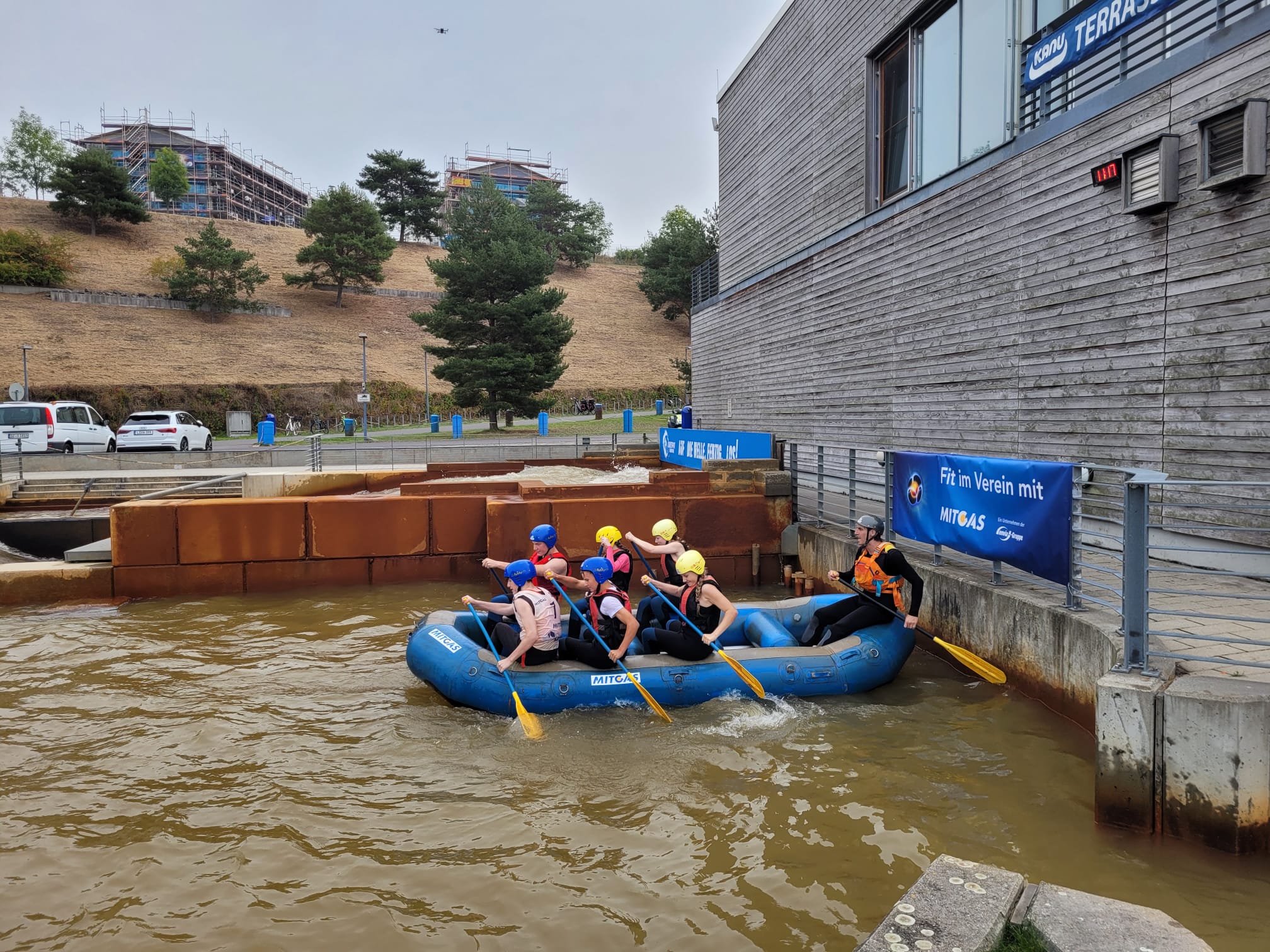 Lara Becker, Lina Schweizer, Isabel Steinert, Danny Klüttermann, Julian Zinner und Tom Wendenburg paddelten im Raft mit der Nummer sieben für unser Gymnasium. Der Modus blieb in der Regel der gleiche wie in den letzten Jahren. Jeder der 12 Teams wollte Zeitschnellstes werden um sich direkt für das Finale zu qualfizieren. Doch diesmal fand dies auf der "Trainingsstrecke" des Kanuparks statt. Demzufolge war die Strecke kürzer und die Zielzeitabstände entsprechend knapper. Wie wir am Ende erfuhren paddelten wir uns mit 63,6 sec. auf den hervorragenden 6. Platz. Zu dem zeitgleichen 4. und 5. Platz fehlten uns nur 0,7 sec. und zum Sieger 3,0 sec.. Das Kopf-an-Kopf-Rennen fuhren wir im "langen Kanal". Wer dies gewann, sollte bekanntlich ebenfalls ins Finale einziehen. In drei Vorläufen starteten wir die ersten beiden mit einem Start-Ziel-Sieg. Besonders bemerkenswert ist diese Leistung vor dem Hintergrund, das im zweiten dieser Läufe Danny über Bord ging und richtig schnell von Isabel aus dem tosenden Kanal gezogen wurde, obwohl das Verfolgerraft nur 5 m hinter uns fuhr. Das dritte Rennen verloren wir leider. Diese drei Rennen bildeten die Basis für den Platzierungslauf. Da mit uns noch zwei weitere Raftteams gleich viel Punkte aufwiesen, zählte die Zeitfahrplatzierung. So fuhren die beiden anderen Teams um den 3. Platz und wir um den 5. Platz. Doch auch dieses Rennen konnten wir souverän für uns entscheiden.