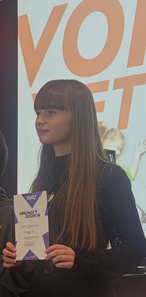 Auch dort hat sie am 30.03.2026 mit ihrem Vortrag aus dem Jugendbuch „Die Geschichte von Malala“ von Viviana Mazza die Jury überzeugt und erneut das Siegerpodest ersteigen können, obwohl die Konkurrenz sehr stark war und Davinia bis zum Schluss nicht auf diesen Erfolg zu hoffen gewagt hatte.