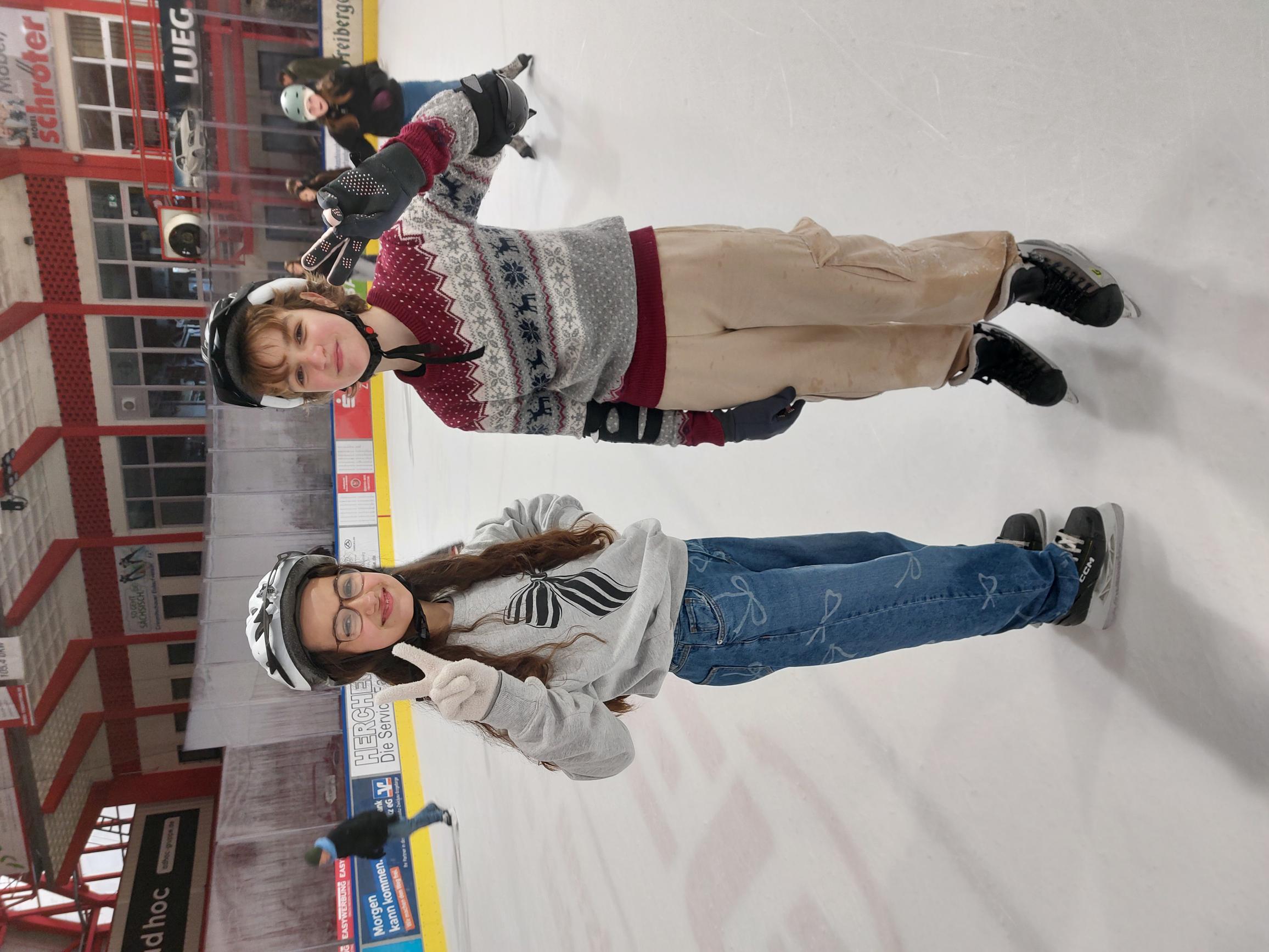 "Unsere Klassenstufe 6 und die 7 b waren am 10.12.2025 in der Eishalle in Crimmitschau, bei den Eispiraten. Wir sind früh am Morgen mit dem Bus losgefahren und danach direkt in die Eishalle gegangen. Wir hatten sehr viel Spaß und es gab auch ein paar kleine Verletzungen. Anschließend erlebten wir eine Rundführung durch die Halle oder die Kabine und erfuhren ein bisschen über die sportliche Geschichte des Vereins. Später sind wir auch mit demselben Bus wieder nach Hause gefahren. Dieser Ausflug war sehr lehrreich."