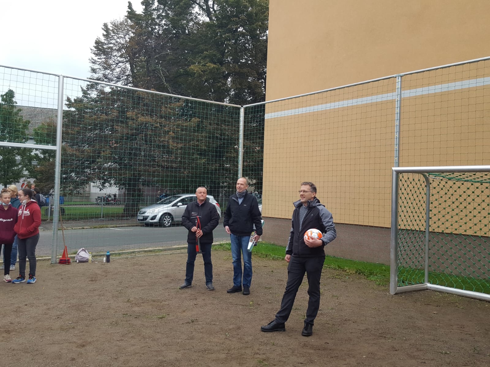 Nach einem langlährigen Hindernislauf konnte der Förderverein den Bolzplatz endlich am 29.09.2021 für die Nutzung in Betrieb nehmen. Die Eröffnung führten die Fördervereinsvorsitzenden Lutz Kermes und Ralf Neuber durch. Herr Reichel von der Städtischen Wohnungsgesellschaft Meuselwitz mbH, welche das Grundstück für den Bolzplatz zur Verfügung stellt, überreichte praktischerweise einen Fußball und eine Ballpumpe. Damit wird an unserem Gymnasium sowohl das soziale Miteinander auf sportliche Weise gestärkt als auch seine Außenwirkung auf positive Weise beflügelt.