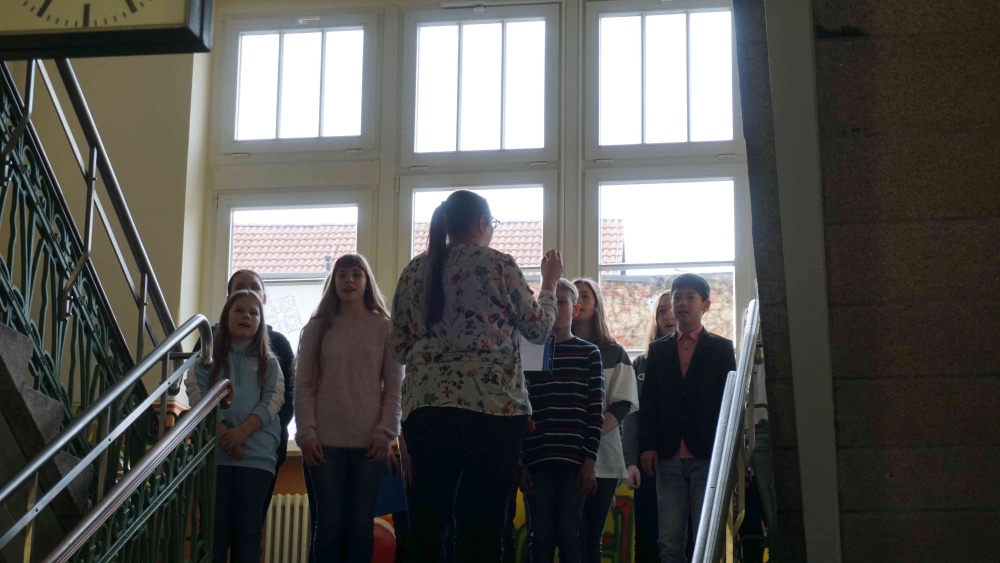 Der Schulchor unter Leitung von Frau Nützel begrüßt Gäste, wie Bürgermeister Pick und die ehemalige Schulleiterin Frau Steinert, ehemalige Schüler, die fleißigen Helfer, Helferinnen, Lehrer sowie die neuen Schüler samt Eltern mit dem Kanon „Dona nobis pacem“ gefolgt von „Halleluja“ von Leonard Cohen. Schülerinnen und Schüler des Darstellen und Gestalten – Kurses der Klasse 9 boten maskiert ein kleines Tanzstück auf der Treppe dar.