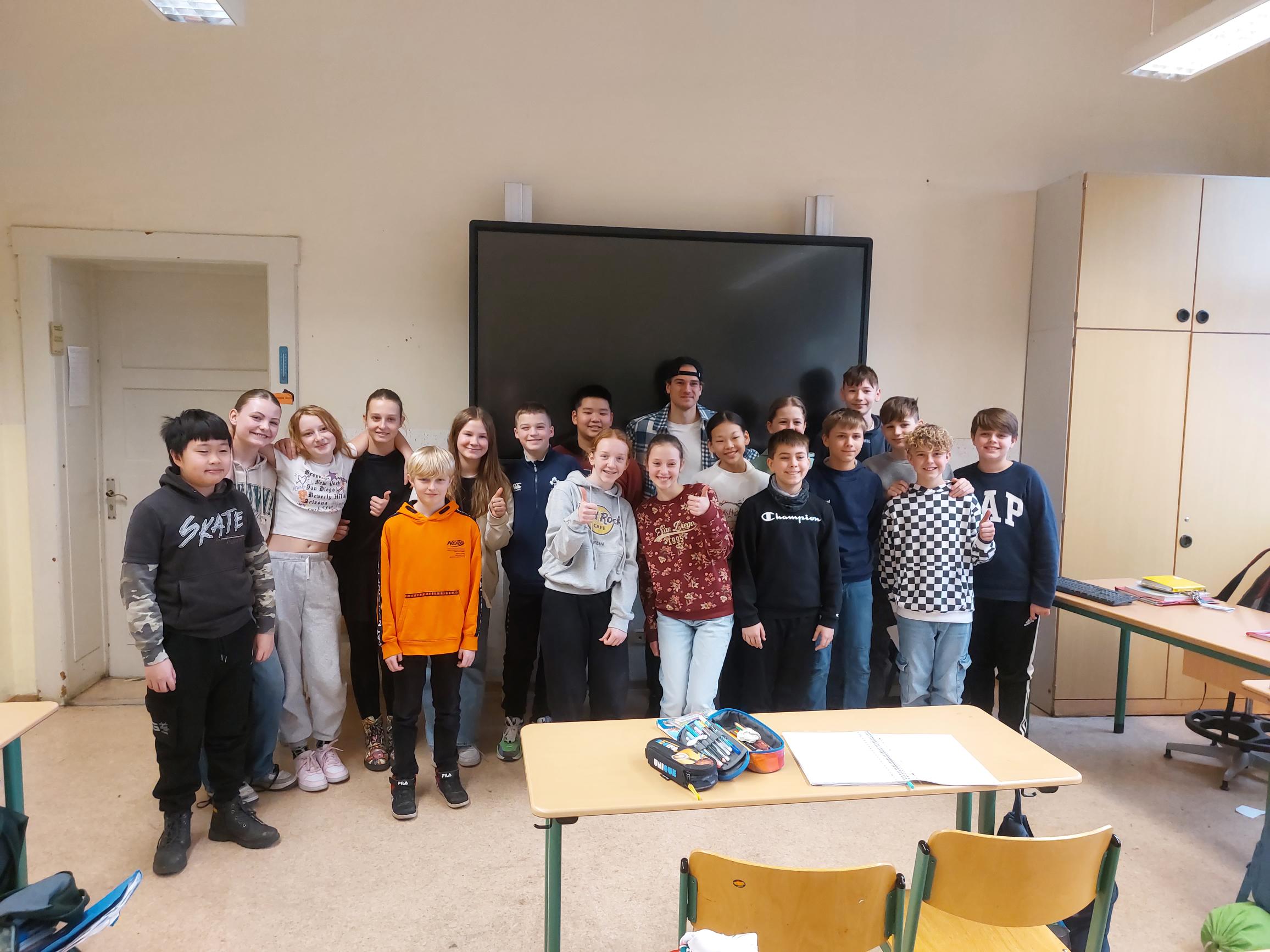 Zur dritten Stunde erwartete die 9b den Kanadier, bevor er in der vierten Stunde von unserer 6c und in der fünften Stunde von der 9a befragt werden konnte. Die Schülerinnen und Schüler waren sehr kreativ und so fand sich der Sportler einem bunten Potpourri an interessanten, aber auch humorvollen Fragen gegenüber, die er gerne und mit sehr viel Charme, in seinem „Canadian-English“, zu beantworten wusste. Begeistert lauschten alle seinen Worten. Am Ende der Stunden war natürlich für alle auch noch Zeit für ein gemeinsames Foto oder das begehrte Autogramm auf einem mitgebrachten Trikot. Und so war es für alle Beteiligten ein unvergessliches Erlebnis, bei dem die Schülerinnen und Schüler das Englisch-Lernen mal ganz anders erfahren konnten.