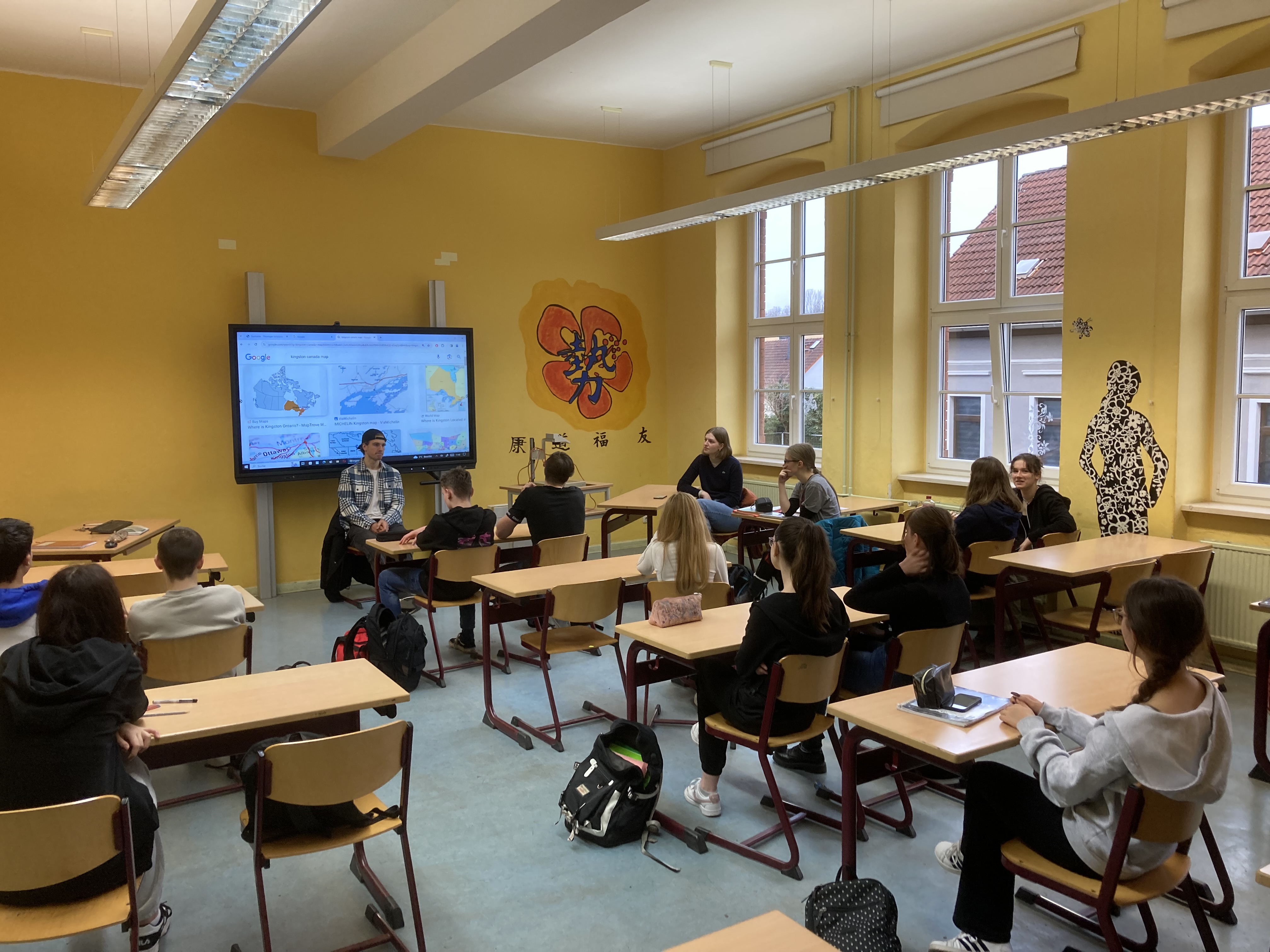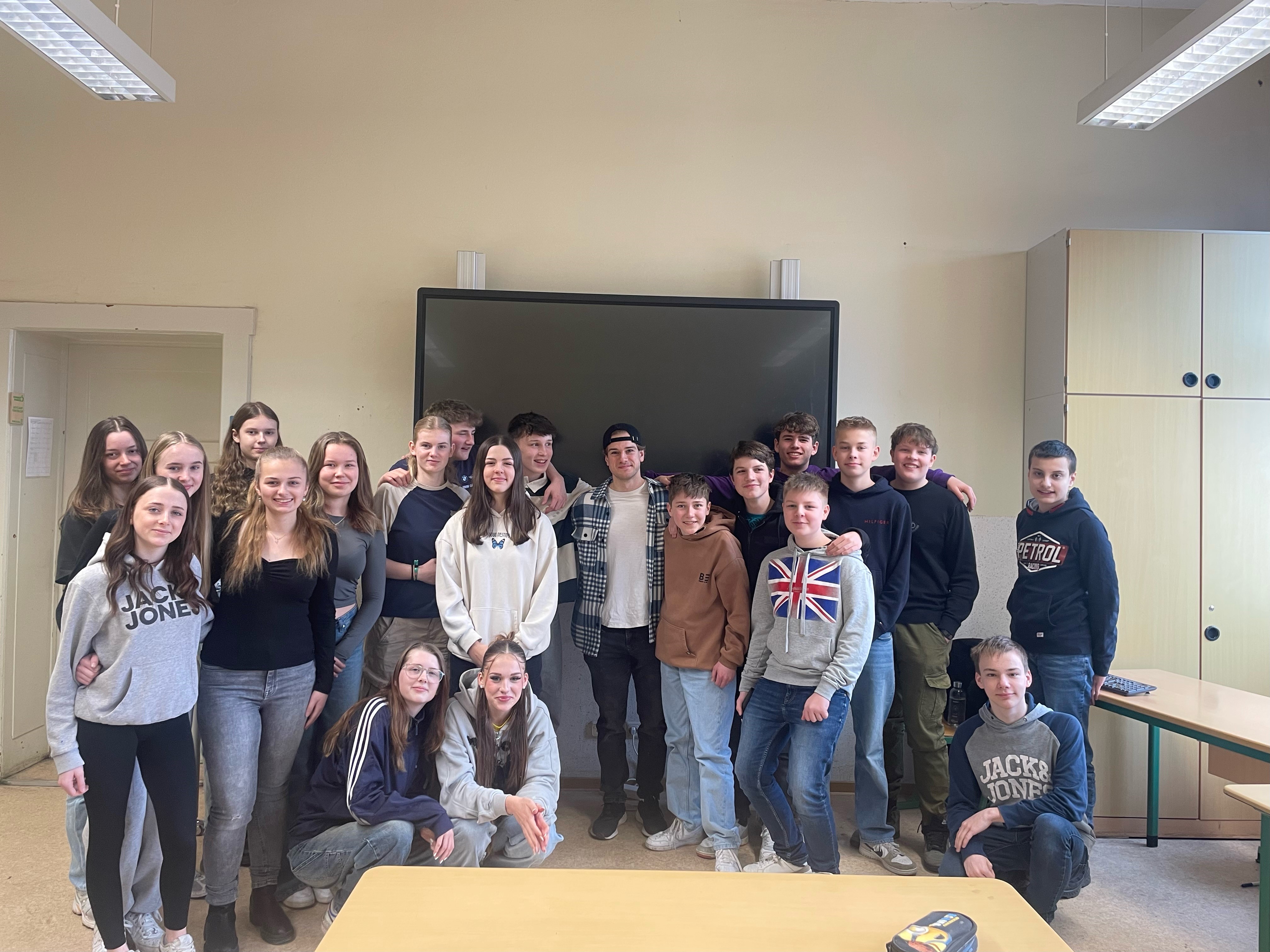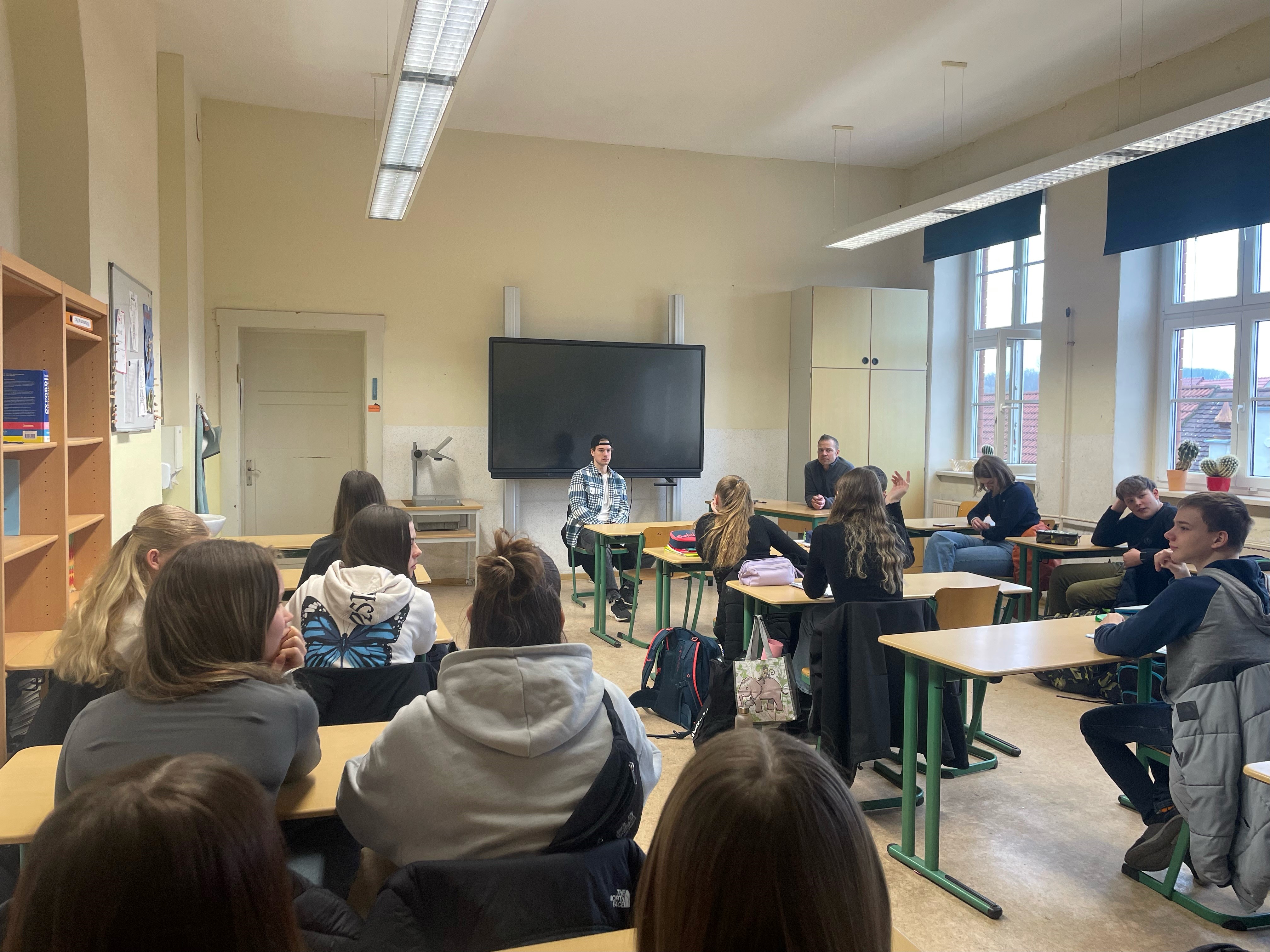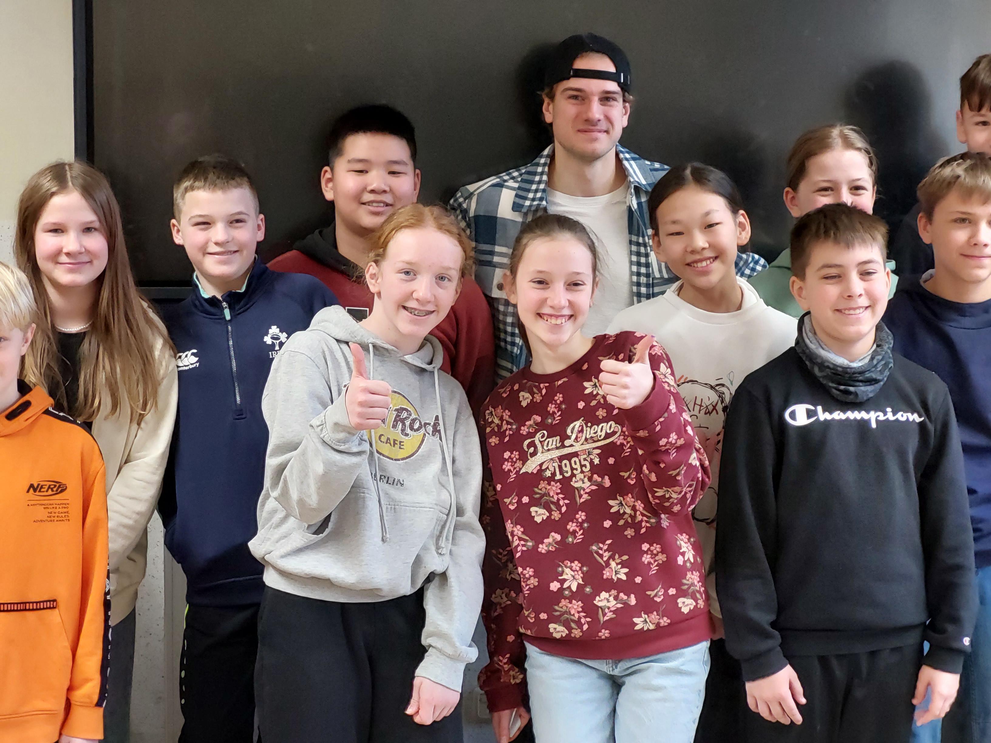 Lange war es nicht sicher, ob es klappen würde, aber dann ging es doch ganz schnell. Am 27.02.2024 fand ein Stürmer der Eispiraten aus Crimmitschau, Hayden Verbeck, den Weg zu uns in die Schule. Voller Vorfreude bereiteten die Schülerinnen und Schüler Fragen vor, die sie dem Spieler in seiner Muttersprache (Englisch) stellen wollten.