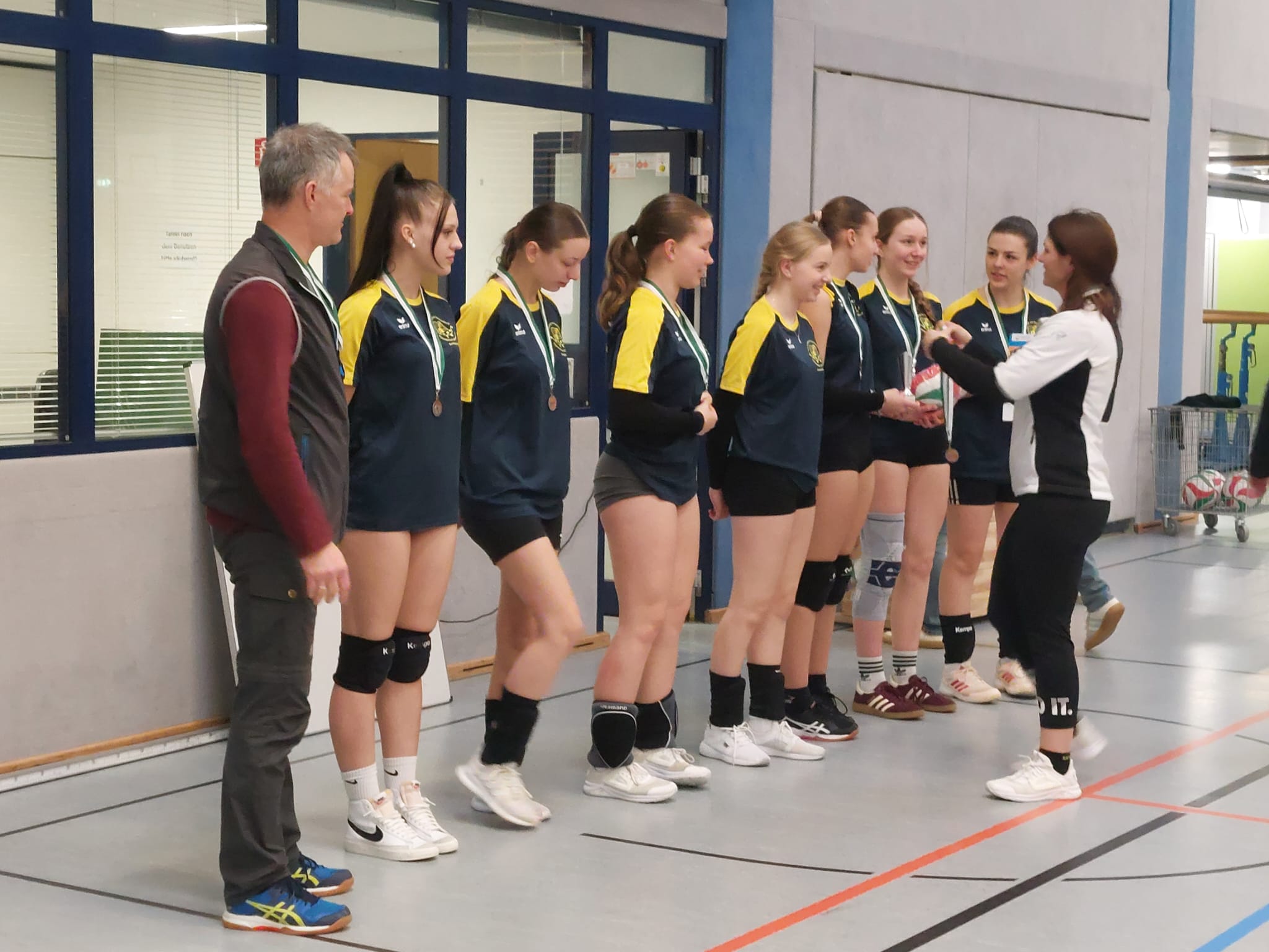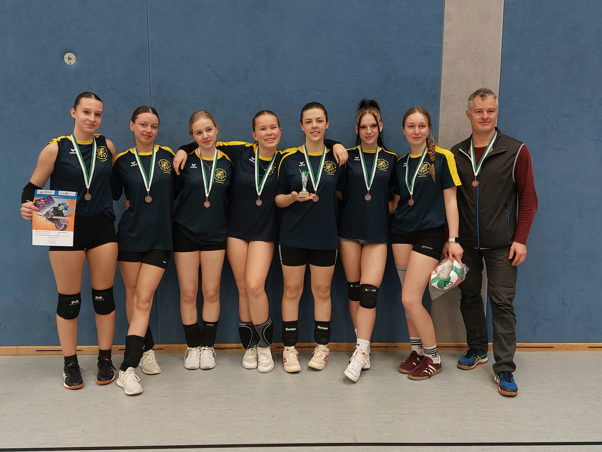 Gespielt wurde in zwei Staffeln mit je drei Teams. Glücklicherweise war unser erster Gegner das Team aus Greiz, welches wir mit 2:0 besiegen und uns zugleich auf die folgenden, ungleich schwereren, Spiele einstimmen konnten. Gegen das Zabel Gymnasium lag die Messlatte schon wesentlich höher. Unsere Mädchen hielten tapfer dagegen, mussten jedoch beide Sätze an die Geraer mit 25:20 und 25:13 abgeben. Im Spiel gegen Jena ging es darum, ob wir anschließend um den Sieg oder den dritten Platz kämpfen durften. Die Jenaer traten selbstbewusst als Team und mit viel Stimmung auf, welches unsere Mädchen mehrfach verunsicherte. Fehler in der Annahme, dem Zuspiel und zu halbherzige Angriffe waren die Ursache für viele verschenkte Punkte. Der Spielsieg lag mehrfach direkt vor der Nase, u.a. mit einzelnen tollen Aktionen, wie Hinterfeldangriffe durch Milla. Doch es sollte nicht reichen. Im Abschlussspiel um Platz drei gegen Eisenberg musste noch einmal alles gegeben werden. Wie man es auch bei "großen Turnieren" hört, fanden sich ebenso unsere Mädchen immer besser im Turnier zurecht und riefen letztlich ihre Leistung zur vollen Zufriedenheit von Herrn Müller ab. Sie stellten sich besser aufeinander ein, es wurden mehr Angriffssituationen herausgearbeitet, die Fehlerquote sank und Lucy peitschte als Stimmungsmacherin auf dem Spielfeld unser Team voran. So gewannen wir den ersten Satz 25:20. Im zweiten Satz führten wir 24:22. Satzball! Der dritte Platz greifbar nah. Doch das Unglaubliche geschah. Eisenberg zog mit 26:24 an uns vorbei. Nun musste es der Entscheidungssatz richten. Ein Spiel auf Augenhöhe, jeder Fehler auf beiden Seiten gab dem Gegner einen Vorteil in die Hand. Spielglück oder Können?- egal- wir gewannen 15:11 und damit können wir unseren Mädchen Lucy Fischer, Milla Quaas, Laura Puppe, Paula Geweniger, Larissa Hanke, Lisa Windisch und Emilia Lochmann zum