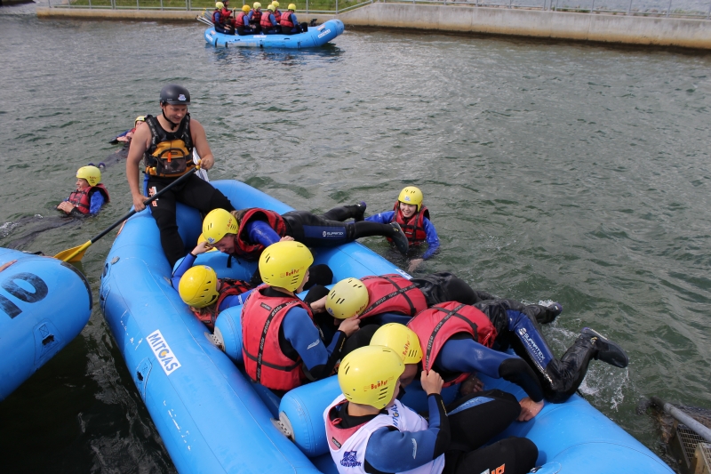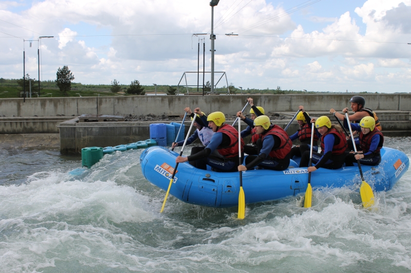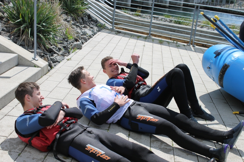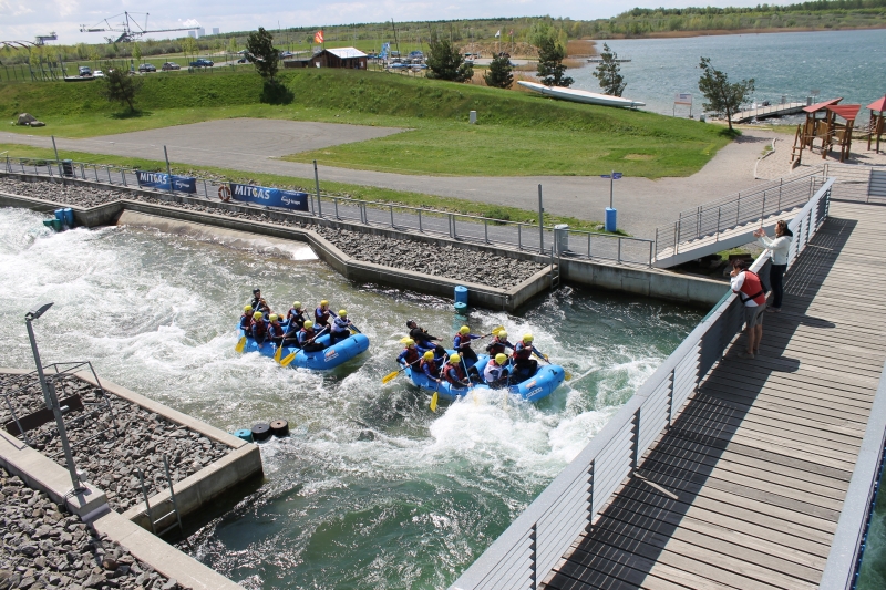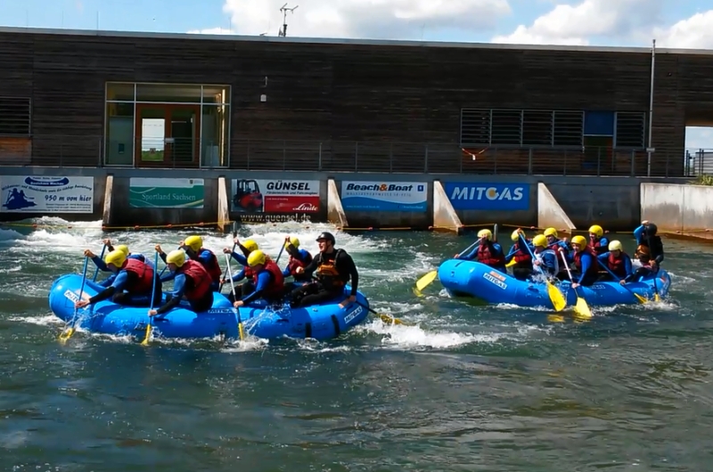 Am Donnerstag, 7. Mai 2015, fuhr zum ersten Mal eine „Raftbesatzung“ unseres Gymnasiums zu den Mitteldeutschen Schülermeisterschaften der 8. und 9. Klassen in den Kanupark nach Markkleeberg. Diese Schüler- Rafting- Meisterschaft findet bereits zum siebenten Mal statt und es starten in diesem Jahr insgesamt 60 Schulteams aus Sachsen, Sachsen-Anhalt und Thüringen. Nur wer die Vorausscheide gewinnt, darf am Finale der „Top 12“ am 09.06.2015 nochmals antreten. Was sollten wir von unserer Premiere in der Qualifikation gegen sieben andere Teams erwarten, von denen nur zwei ins Finale einrücken konnten? Hatten wir überhaupt eine Chance im Vorderfeld zu landen? Die Aufregung unseres Teams mit Ayleen Quaas, Lisa-Marie Albrecht, Tara Müller, Felix Schirmer, Paul Freyer, Maurice Geenen und Tim Müller war dementsprechend hoch. Vorerfahrung hatte keiner von uns! Unser betreuender Sportlehrer Herr S. Müller legte deshalb das Motto fest: in diese aktive und erlebnisreiche Sportart hineinzuschnuppern, als Team aufzutreten, den Sporttag zu genießen und trotzdem bis an die eigenen sportlichen Grenzen zu gehen, um ein bestmögliches Ergebnis zu erzielen.