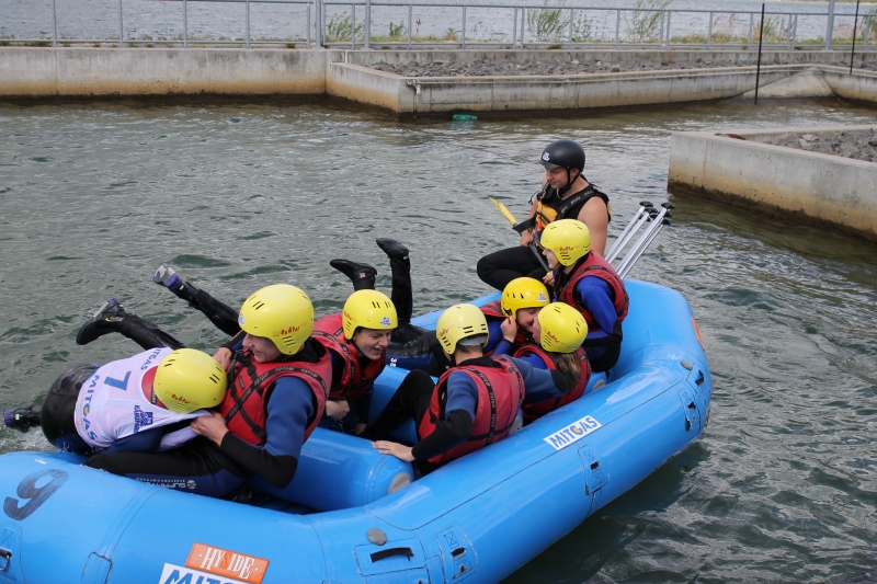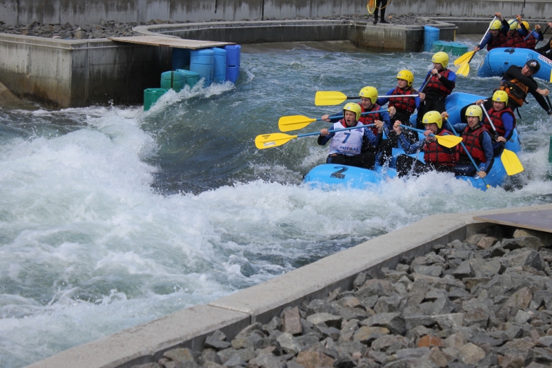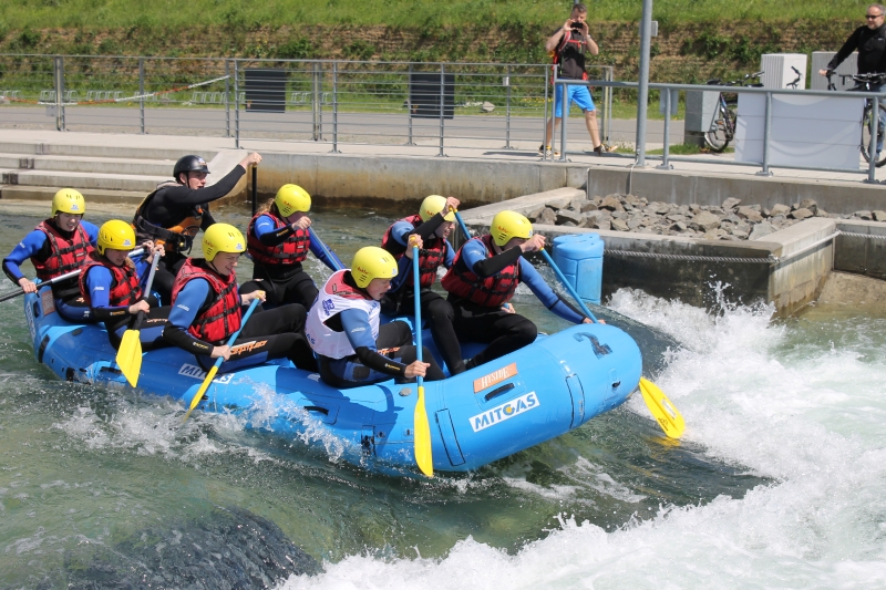 Dann ging es los. Zwei Zeitläufe über eine 250 m lange Strecke, bei denen das zeitschnellste Team sich automatisch für das Finale qualifizierte. Drei Turbinen ließen dazu 10000 l Wasser pro Minute in den Kanal tosen und brausen. Da hieß es 80 Sekunden lang volle Konzentration und volle Power! Doch die Spannung blieb hoch, denn die Fahrzeiten wurden erst in der Schlussauswertung genannt. Also, Pause genießen, Kraft tanken und die zweite Chance nutzen. Der zweite Finalist wurde im „Head to Head“ Rennen ermittelt. Kurz: in einem k.o.-ähnlichen System musste das Siegerteam in vier Läufen hintereinander als erster das Ziel erreichen. Unser Team fuhr im Gleichklang kraftvoll und dynamisch. Das Unmögliche gelang! Das Ticket für das Finale wurde gelöst. Und zu allem Erstaunen war unser Team auch das Zeitschnellste mit 79,1 Sekunden! … WIR SIEGTEN!