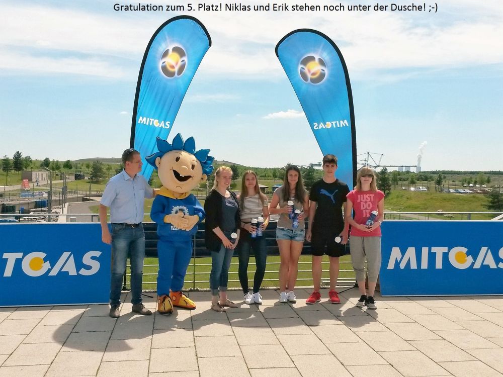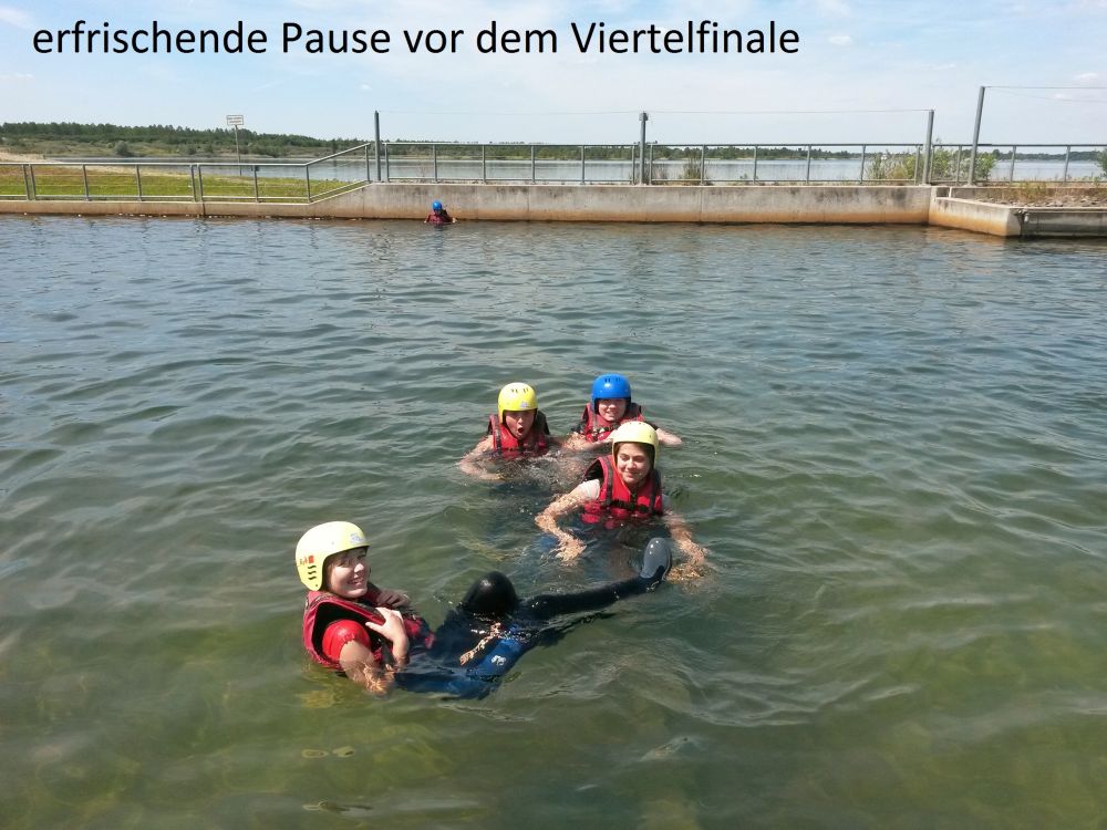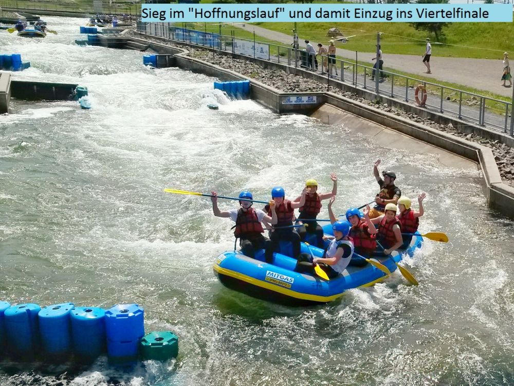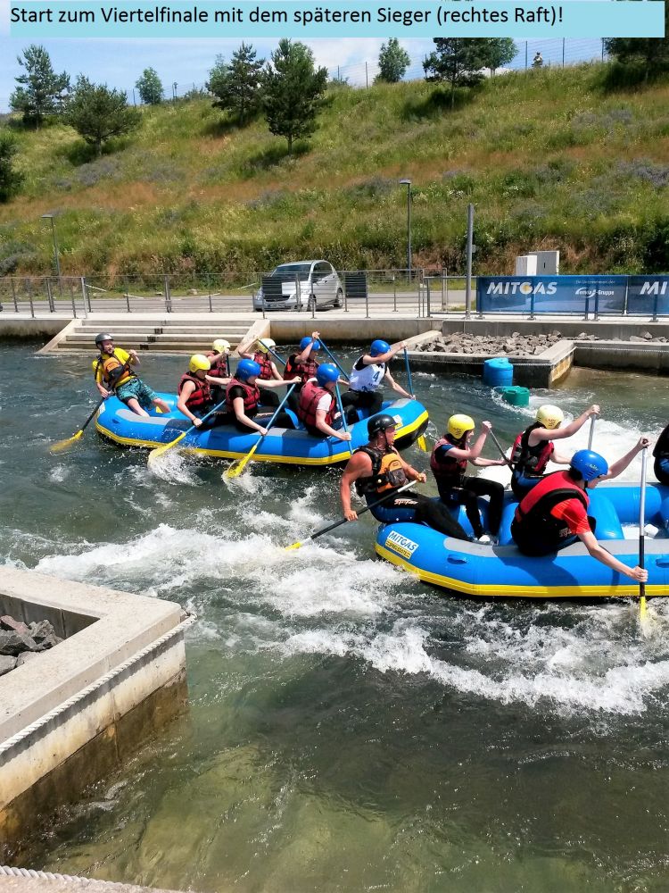 Unser Raftteam „Schnauderpower“ mit Jessica Koch, Tara Müller, Ayleen Quaas, Laura Kullack, Erik Fröde, Niklas Pokorny und Moritz Schmidt stand bereit, gegen die 11 besten Schülerteams aus Mittelsachsen anzutreten. Am 12. Mai 2016 hatten sie sich als das zeitschnellste Raft für dieses Finale qualifiziert. Konnten Sie damit auch heute auftrumpfen? Die sechs zeitschnellsten Rafts sollten gleich ins Viertelfinale einziehen. Das war eine große Motivation und zugleich eine Herausforderung. Nach zwei Probeläufen fanden die zwei Zeitläufe statt. Letztlich war unserem Team Fortuna nicht hold. Einige Schlenker und Kollisionen mit Hindernissen auf der Strecke ließen diese Träume schnell platzen. Am Ende blieb nur die zehntschnellste Zeit! Nur ein Sieg im Hoffnungslauf (head-to-head-Rennen gegen zwei Rafts) konnte den Einzug ins Viertelfinale retten. Die Mittagspause am und im 23° C warmen Markkleeberger See half sich neu zu sammeln und vielleicht auch einen passenderen Guide und Startposition zu erwischen. Das Erstaunliche gelang! Jetzt war wieder alles möglich, sogar der Gesamtsieg. Ab dem Viertelfinale ging es nur noch darum, als erstes Raft im Ziel anzukommen. Der erste Gegner war das „Ostwald“ Gymnasium Leipzig. Nach dem Startkommando schien die Taktik unseres Guides aufzugehen, das „Ostwald“-Raft abzudrängen. Doch dieses konnte sich noch vor der Einfahrt in den Kanal vor unser Raft setzen. Unser Team kämpfte und blieb auf Tuchfühlung. Doch es reichte leider nicht. Wir wurden knapp geschlagen und kämpften im „kleinen Finale“ um die Plätze fünf bis acht. Vier Rafts stehen an der Startlinie. Ein Traumstart unseres Teams lässt unser Raft sofort an die Spitze ziehen und es gewinnt mit einem großen Vorsprung. Am Ende steht der 5. Platz im Finale von 72 Raftteams im gesamten „MITGAS Schüler-Rafting“. Eine super Leistung! Gratulation! Für die Mädchen war das die letzte Finalteilnahme, denn der Wettbewerb gilt nur für die 8. und 9. Klassen. Niklas, Erik und Moritz sind alle noch 8. Klasse und sich ganz sicher: „Nächstes Jahr möchten wir gern wieder auf unserer Startliste stehen!“.