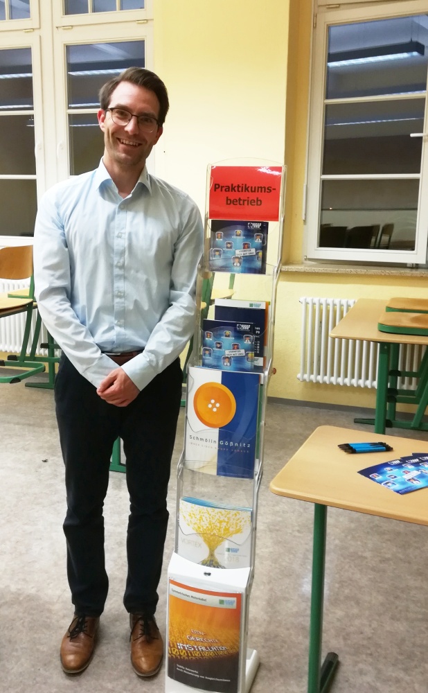 Anschließend erläuterte Herr Brenner (InduSol GmbH) die Möglichkeiten vieler technischer Studiengänge in seinem Unternehmen, welches mit 121 Mitarbeitern in Schmölln ansässig ist. Er empfiehlt vorab Praktika und/oder Ferienarbeit. In seiner Firma kann man sich zeitnah (nicht unbedingt ein Jahr im Voraus) bewerben.