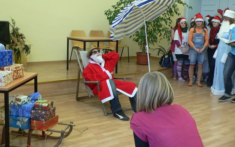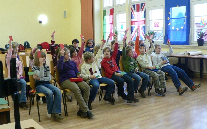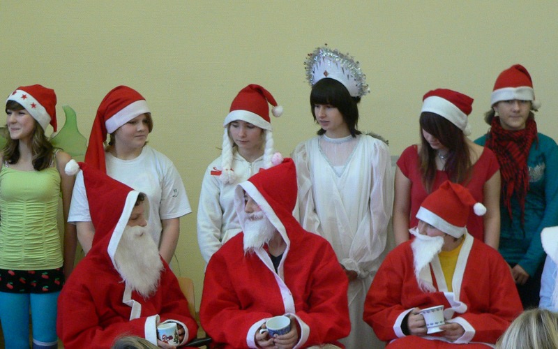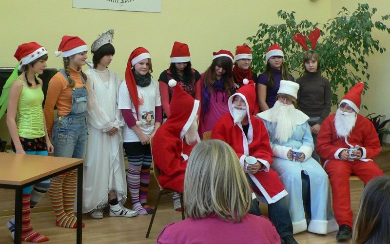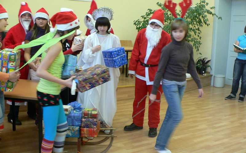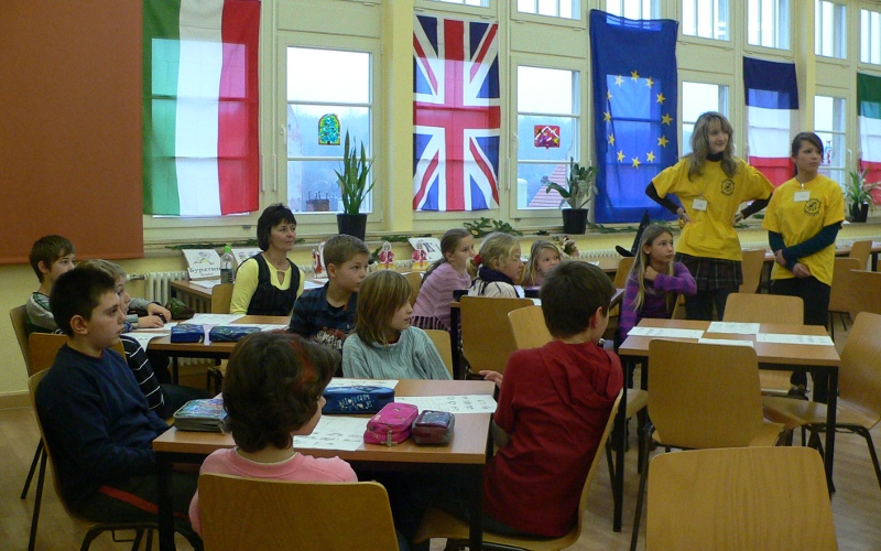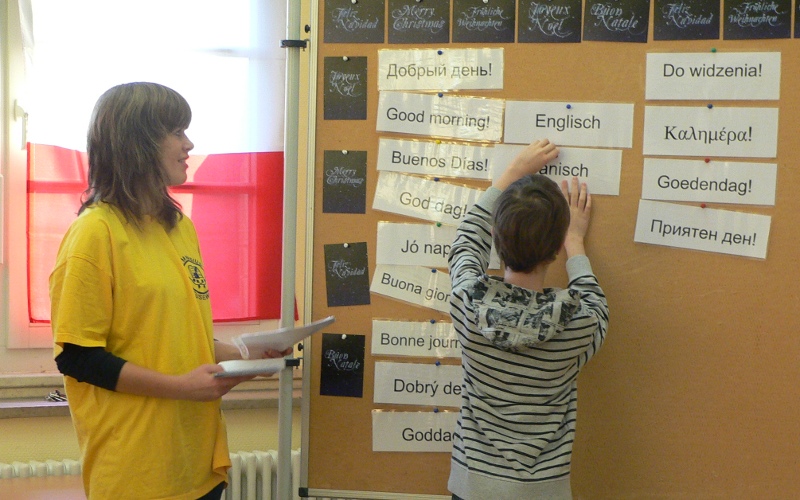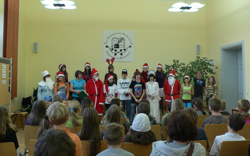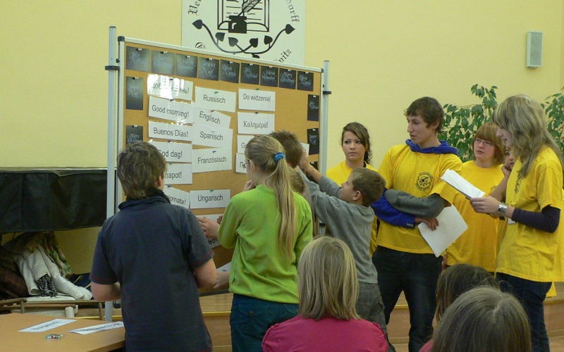 Mit Rat und Tat standen die „Gelben Engel“ den Viertklässlern stets als Berater zur Seite. Schüler der 8b präsentierten im Rahmen einer virtuellen Reise am Smart Notebook verschiedene Länder Europas, vermittelten Wissenswertes und Besonderheiten einzelner Länder. In einem Quiz wurde natürlich überprüft, was sich unsere Gäste an Wissen erworben hatten. Mit großem Interesse waren die Unterstufler dabei Sprachen zu lernen. Italienisch und Russisch standen auf ihrem Stundenplan, wobei sie es faszinierend empfanden in einer Art Geheimschrift ihren Namen in Russisch zu schreiben und erste italienische Wörter zu sprechen. Höhepunkt bildete das Theaterstück um ein Weihnachtsfest, das fast ausgefallen wäre. In witzigen Kostümen und einem Mix aus verschiedenen Sprachen bewiesen die Schüler der achten Klassen, dass sie durchaus gute Schauspieler sind. Mit großem Beifall ging für alle Beteiligten ein etwas anderer Schultag zu Ende. Für die Grundschüler gab es viel Neues zu entdecken und für unsere Schüler war das Lernen mit Schülern erneut eine Herausforderung und „echt harte Arbeit“.