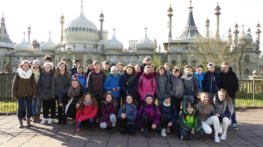 Am Donnerstag sind wir nach dem Sprachunterricht mit dem Bus 2 Stunden lang nach Brighton gefahren. Dort machten wir eine Stadtrundgang unter der Leitung von Frau Nützel. Zuerst liefen wir zum Royal Pavillon, was eine Residenz des Königs Gregor dem 4. war. Das Märchenschloss hat einen Park als Garten und war von außen einem indischen Palast gleich, das hat uns sehr gefallen. Es hatte von innen einen chinesischen look, wir konnten es aber leider nur von außen sehen. Anschließend lief die Gruppe zum Brighton Pier, eine sehr lange Seebrücke mit Unterhaltung, mit Spielhalle, verschiedene Achterbahnen, Brighton Wheel, Essmöglichkeiten und vieles mehr. Einige Schüler waren auch am Steinstrand und beobachteten die Wellen, ein paar wurden auch nass. Als der Tag langsam vorüber ging machten die Lehrer noch ein Gruppenfoto vor dem Brighton Pier. Dann holte uns der Busfahrer ab und als wir in Hastings angekommen waren gingen wir zu unseren Gastfamilien.