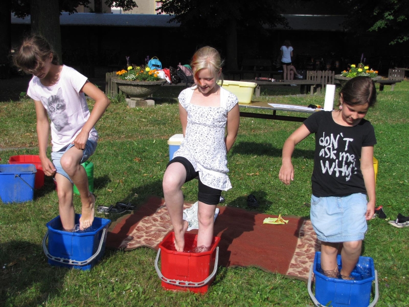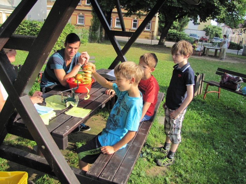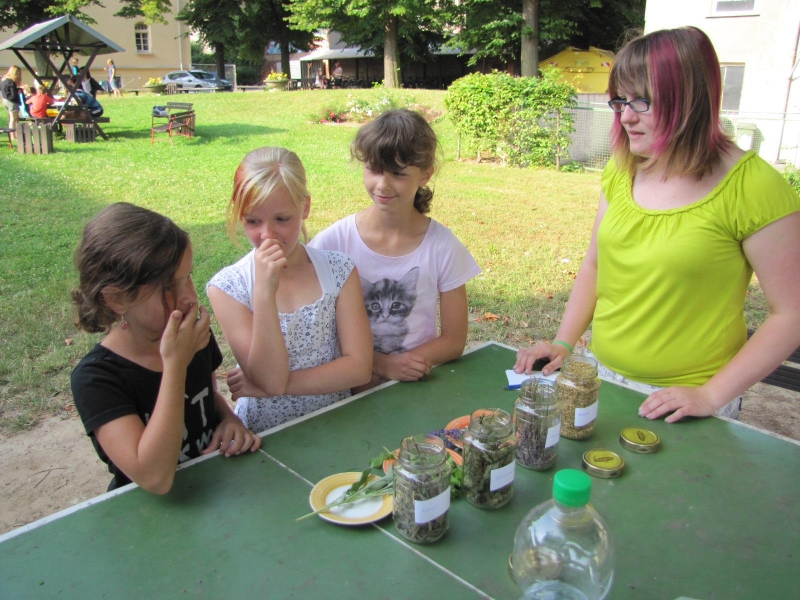 Nachdem wir am Montag zahlreiche Vorbereitungen für unseren Kneipp-Tag getroffen haben, nahmen die Grundschüler aus Lucka am Mittwoch, den 10. Juli, mit Begeisterung an unserem Projekt teil. Dabei konnten sie die fünf Säulen der Kneipp-Medizin kennenlernen und ausprobieren. Im Stationsbetrieb haben sie sich gesund ernährt, die heilende Kraft des Wassers gespürt, ihr inneres Gleichgewicht gefunden, ihren Körper in Aktion erlebt und die faszinierende Welt der Kräuter erfahren. Die Drittklässler hatten dabei sehr viel Spaß und haben viel Neues erlebt. Auch wir Schüler der 11. Klasse hatten viel Freude an der Arbeit mit den „Kleinen“.