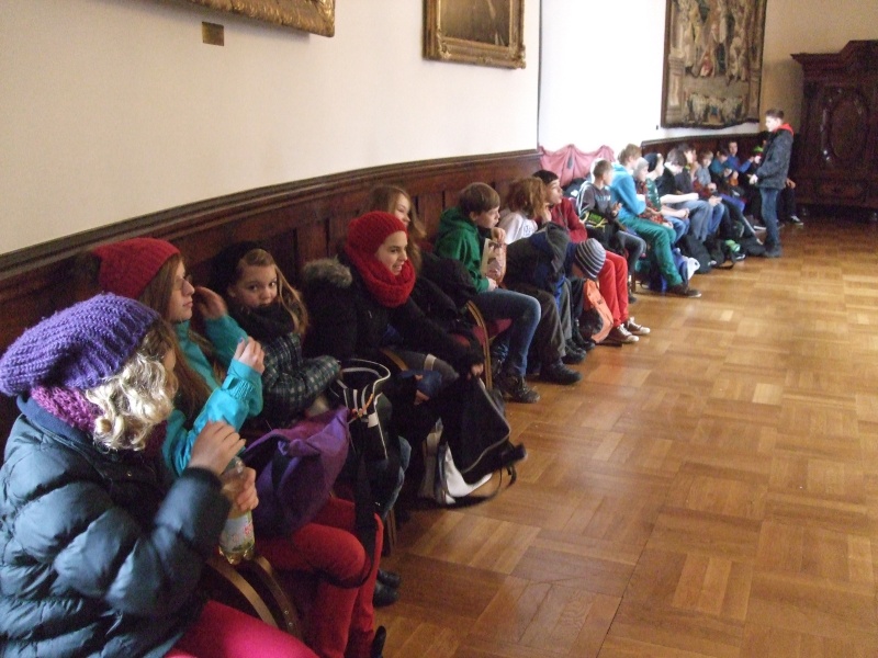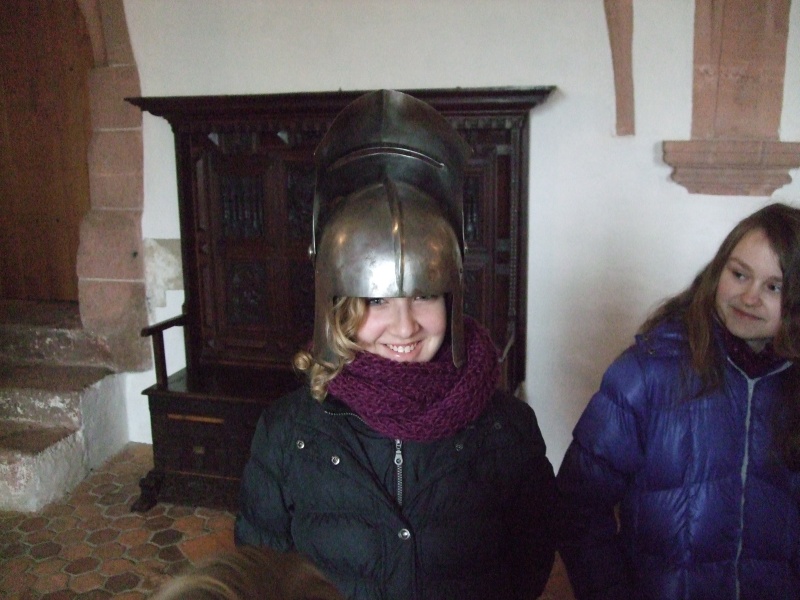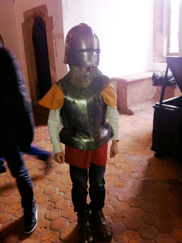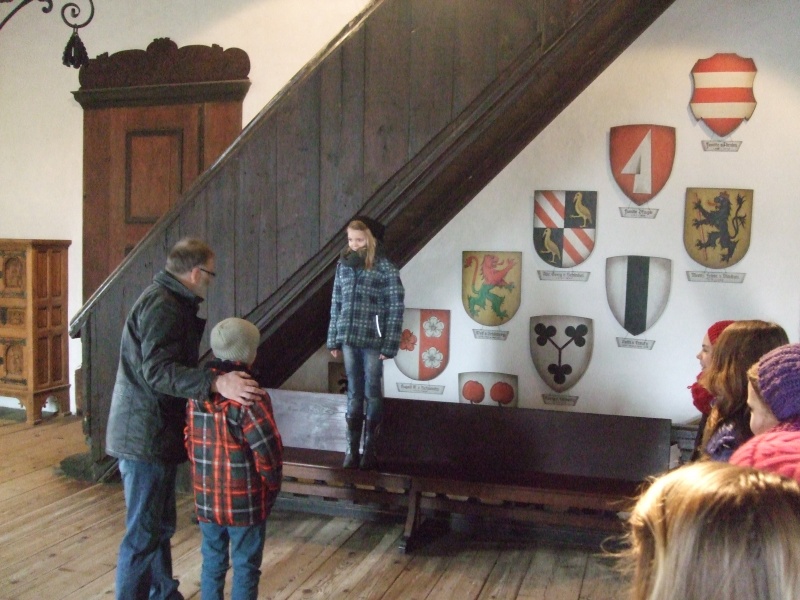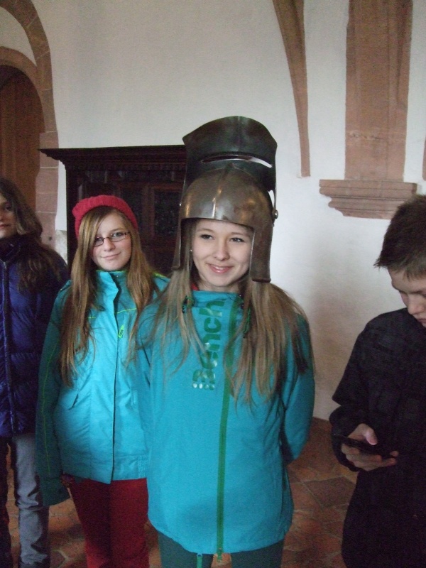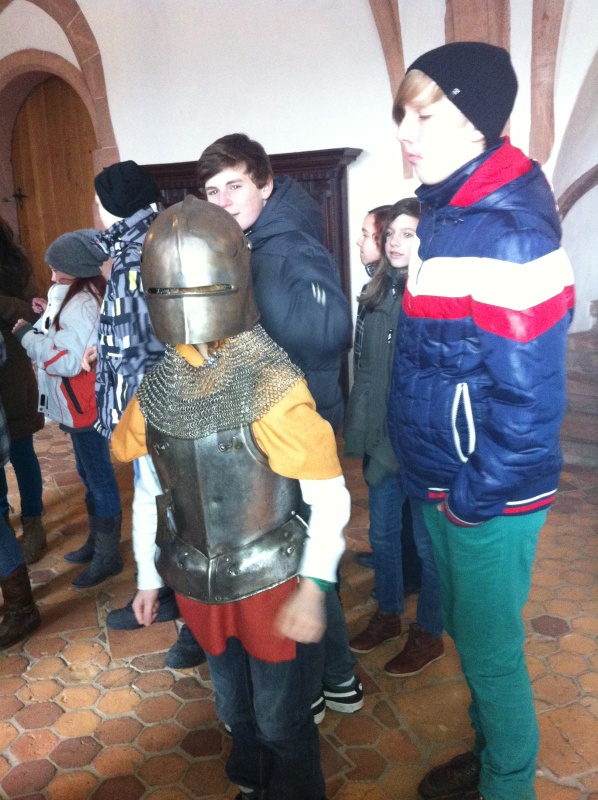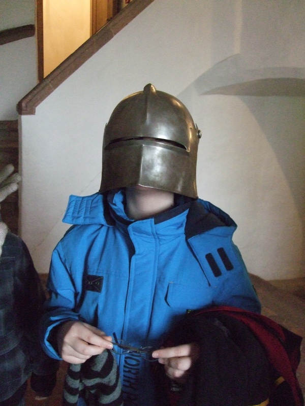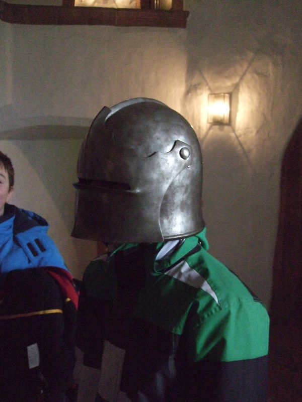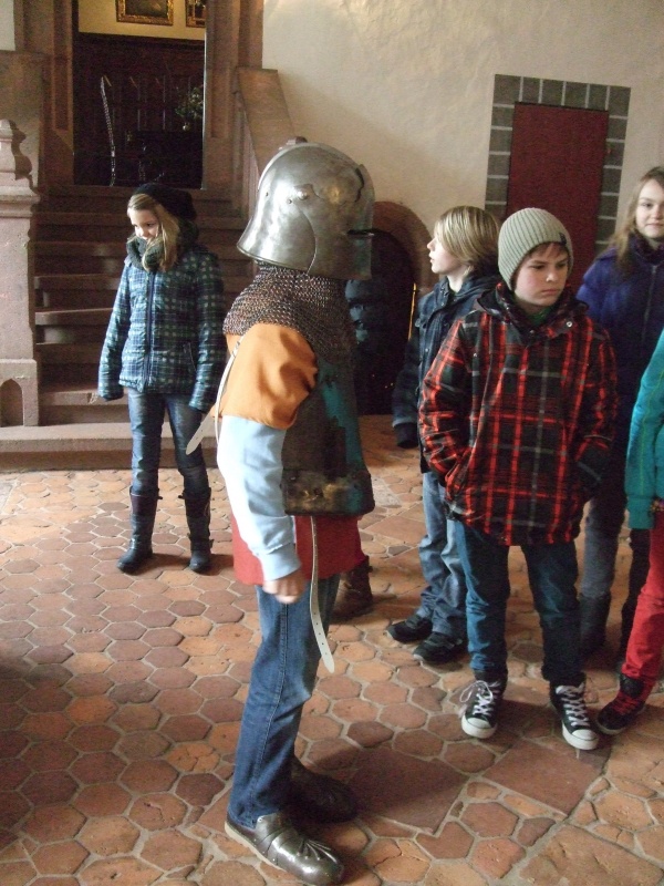 Danach ging es ein Stockwerk höher, wo uns Herr Möbius, ein Mittelalter- Spezialist, anschaulich erklärte, wie das Leben auf der Burg früher ablief. Linus durfte auch eine Ritterrüstung anprobieren und wir waren alle überrascht, wie schwer z. B. ein ritterliches Schwert sein konnte.
