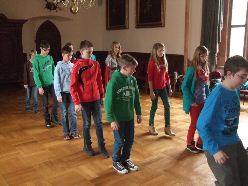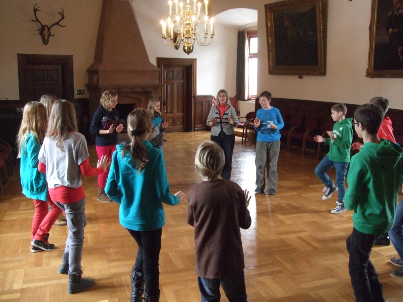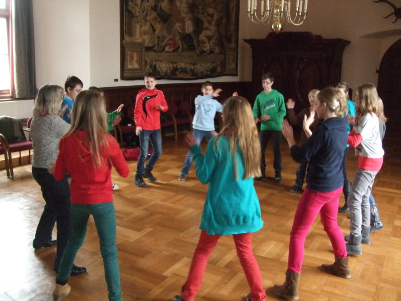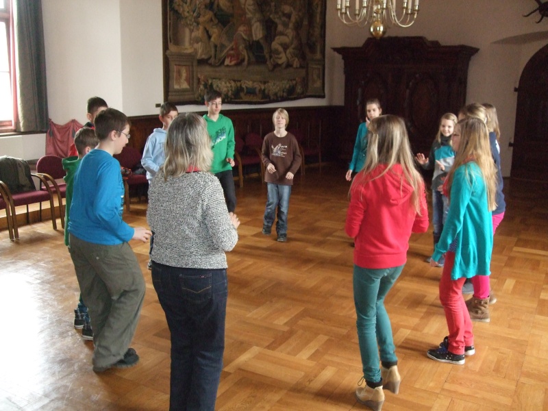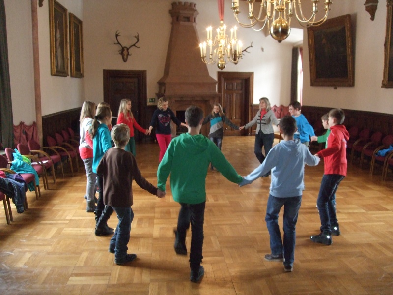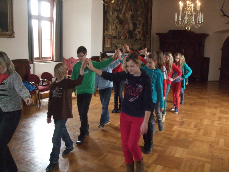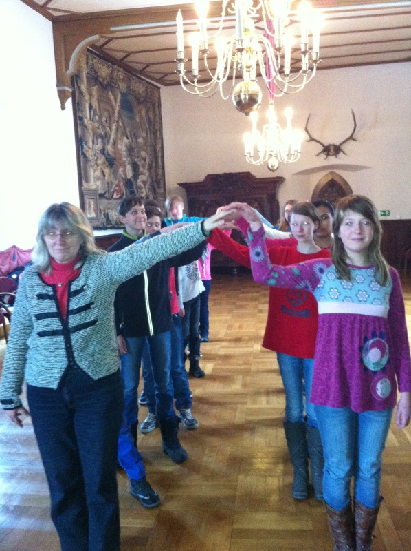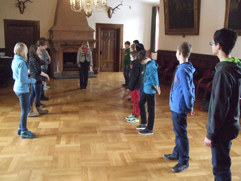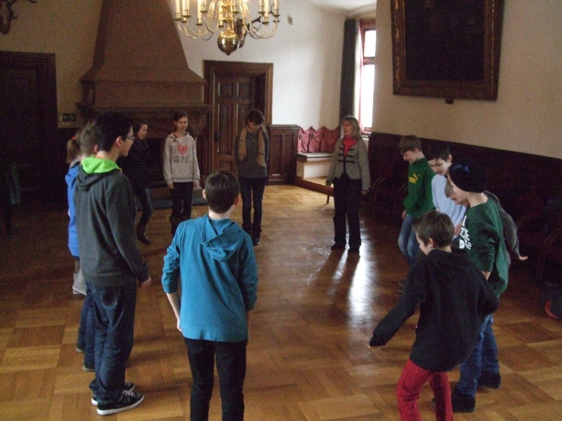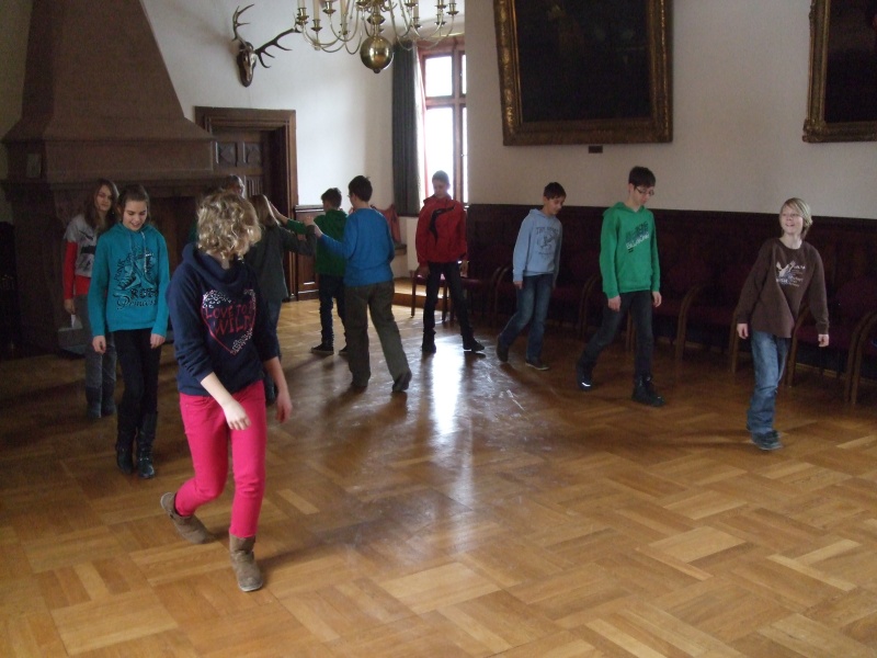 Unsere erste Station hieß Tanzen. Dort lernten wir den mittelalterlichen Tanzstil kennen und tanzten gemeinsam Kreis- und Paartänze.