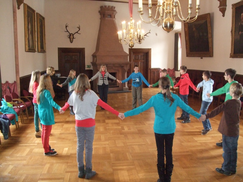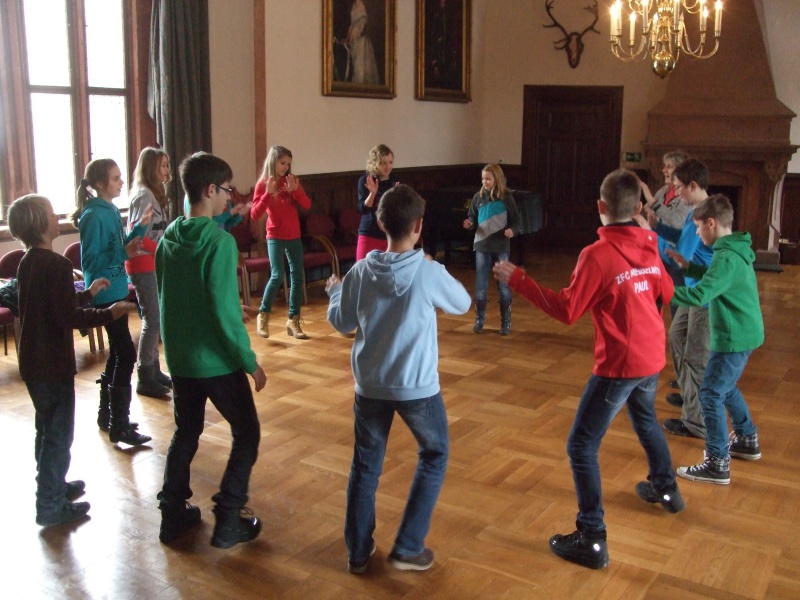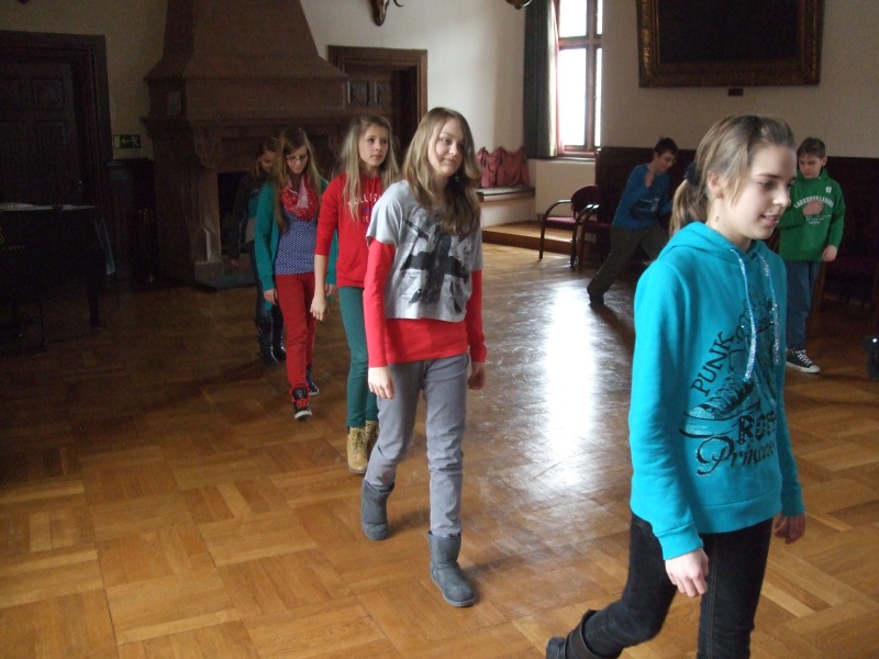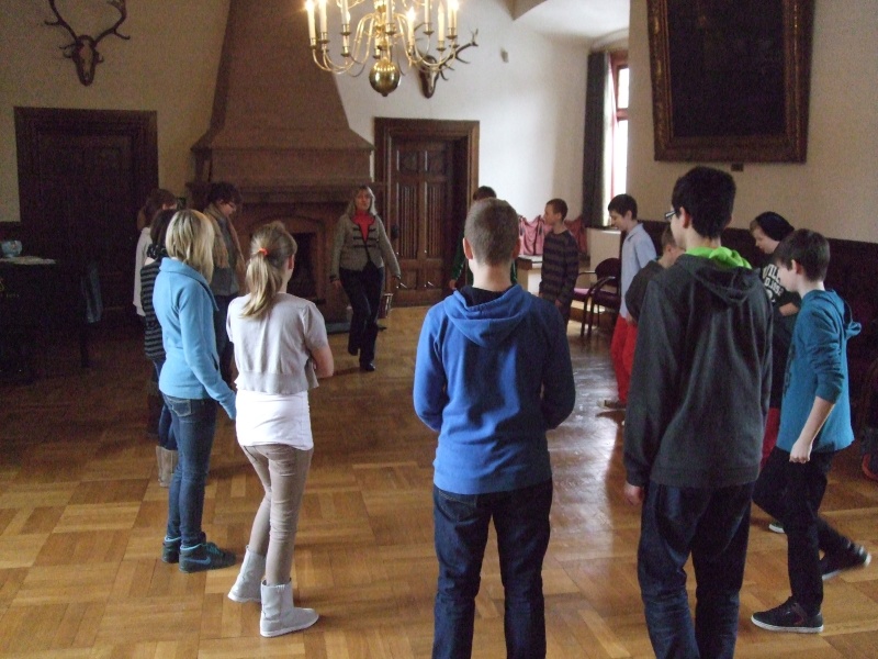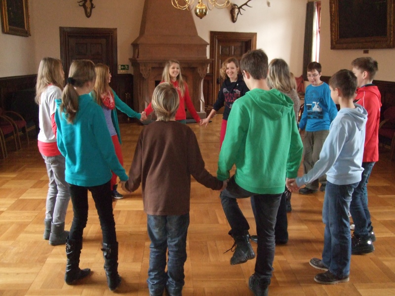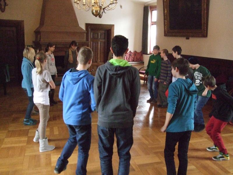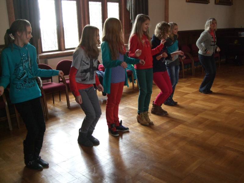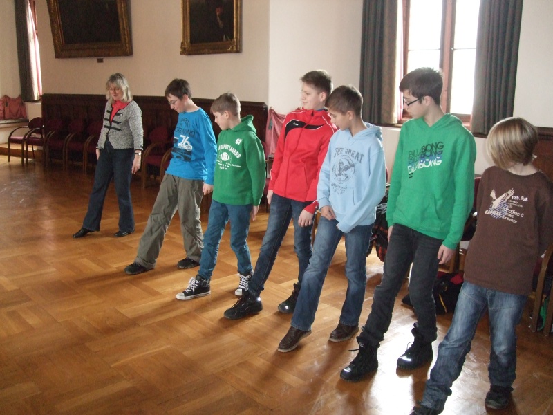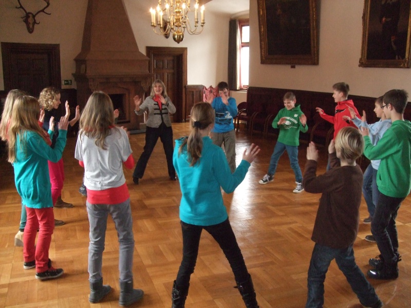 Unsere erste Station hieß Tanzen. Dort lernten wir den mittelalterlichen Tanzstil kennen und tanzten gemeinsam Kreis- und Paartänze.