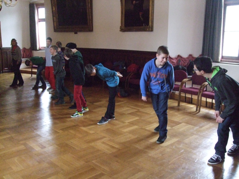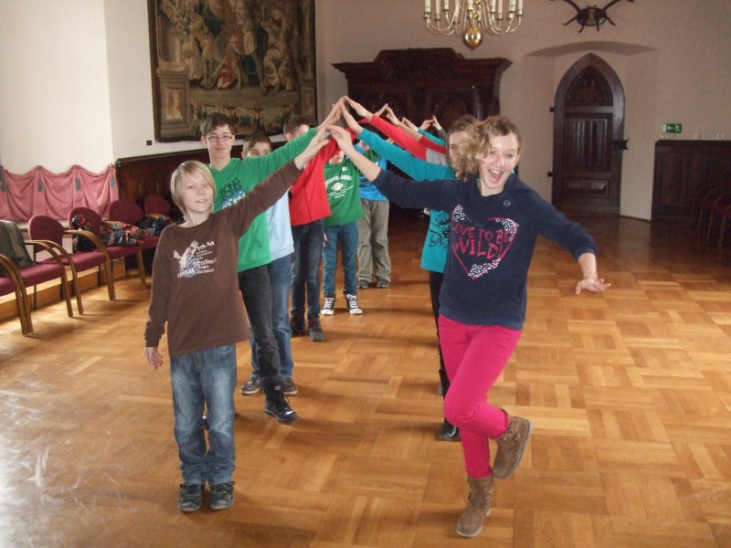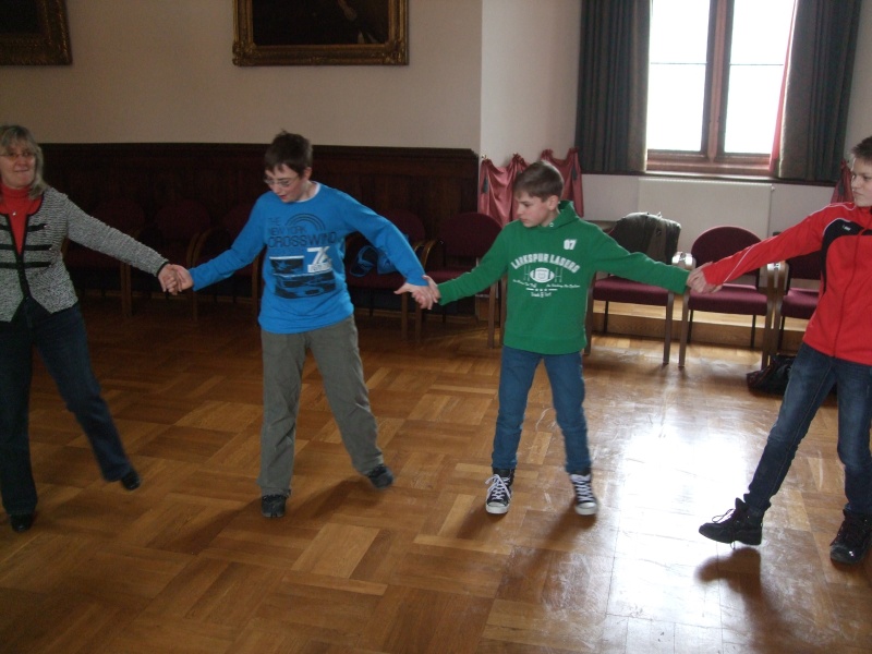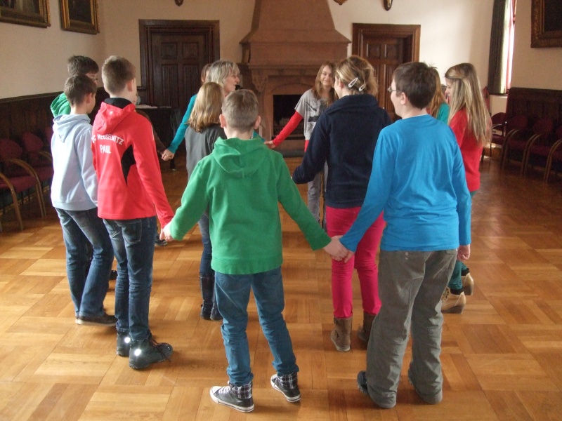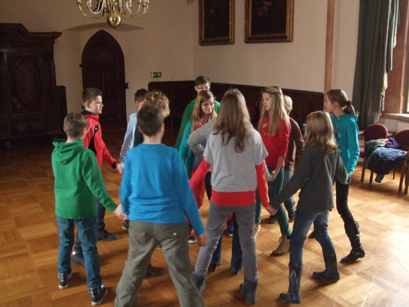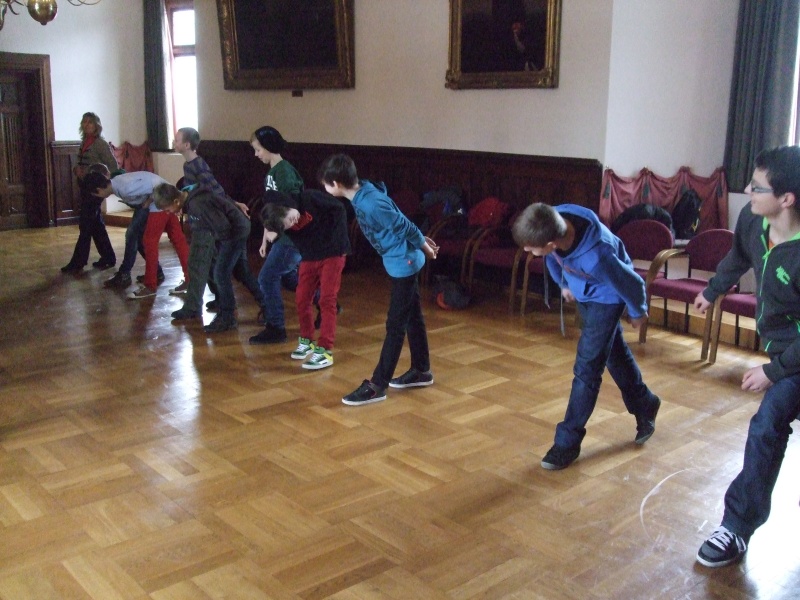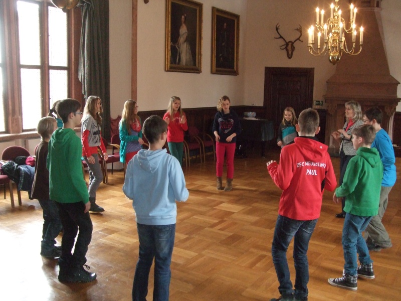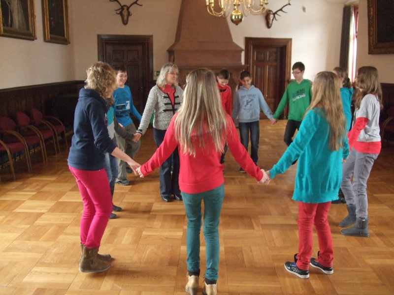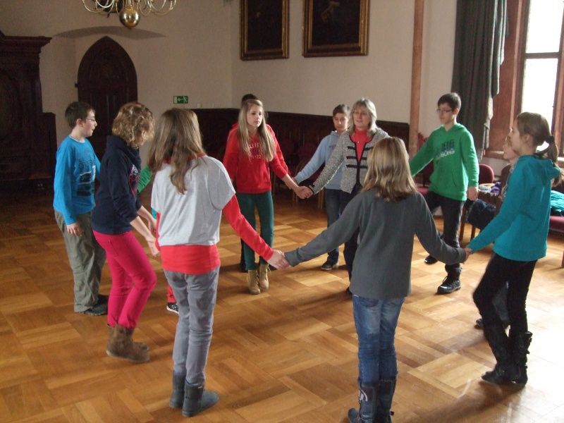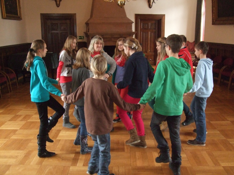 Unsere erste Station hieß Tanzen. Dort lernten wir den mittelalterlichen Tanzstil kennen und tanzten gemeinsam Kreis- und Paartänze.