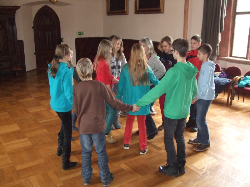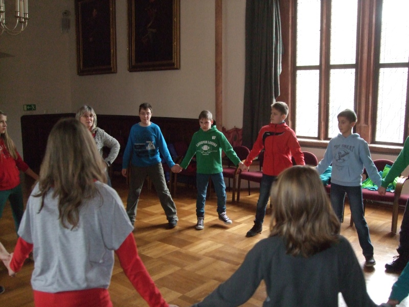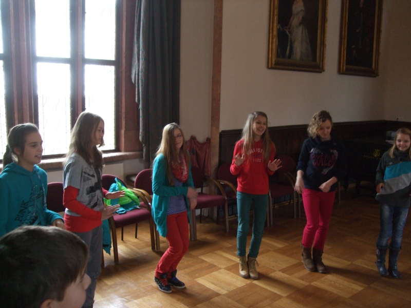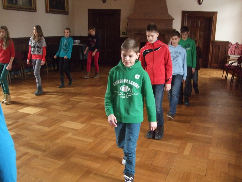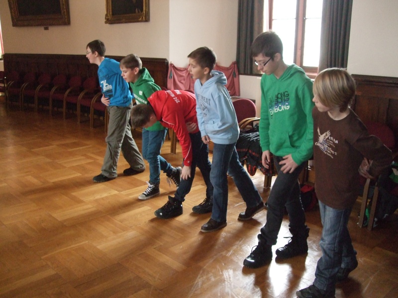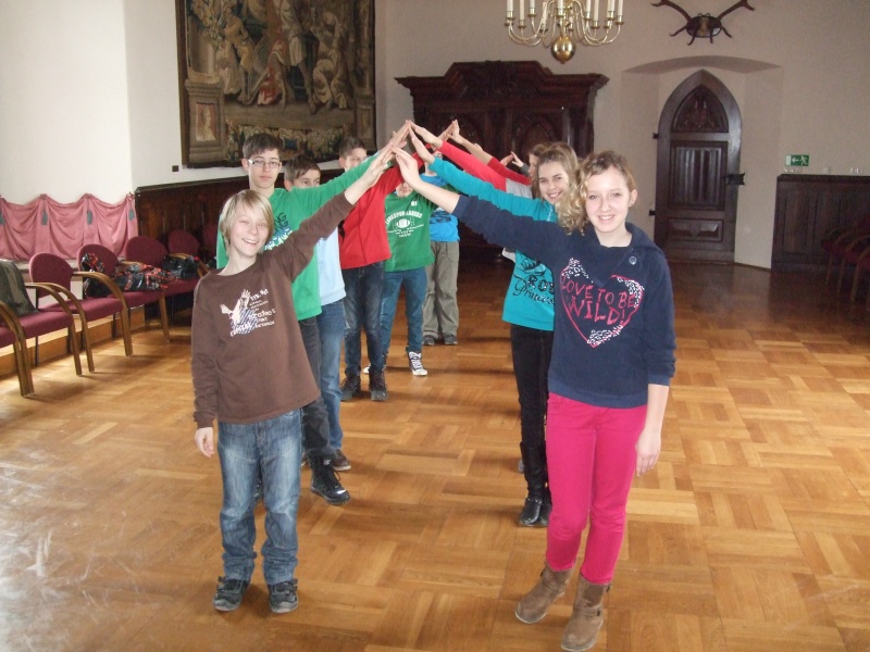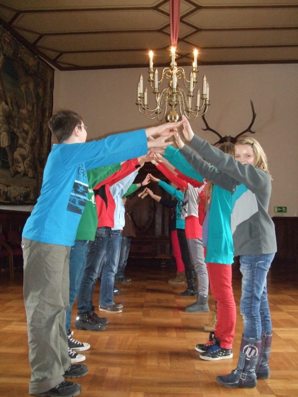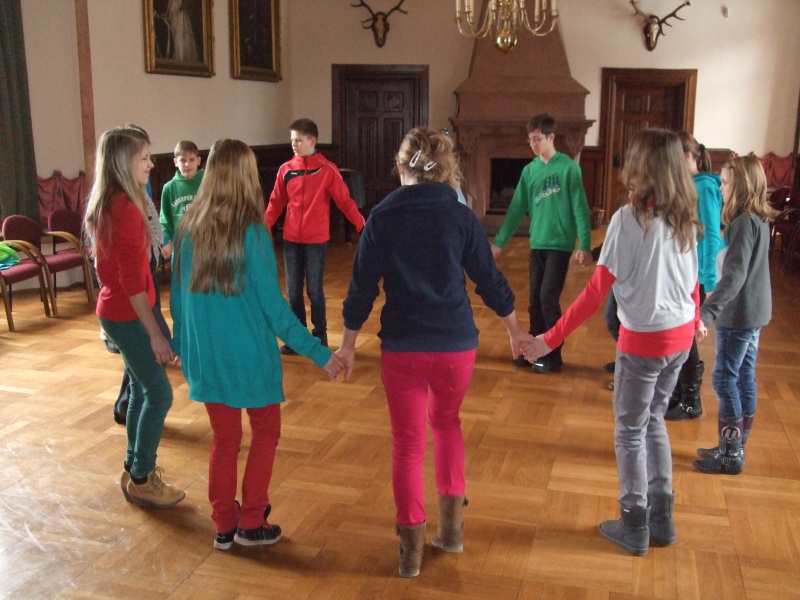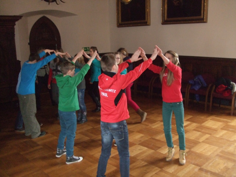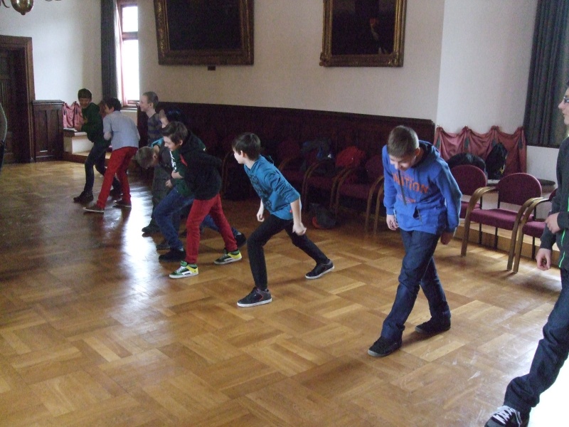 Unsere erste Station hieß Tanzen. Dort lernten wir den mittelalterlichen Tanzstil kennen und tanzten gemeinsam Kreis- und Paartänze.