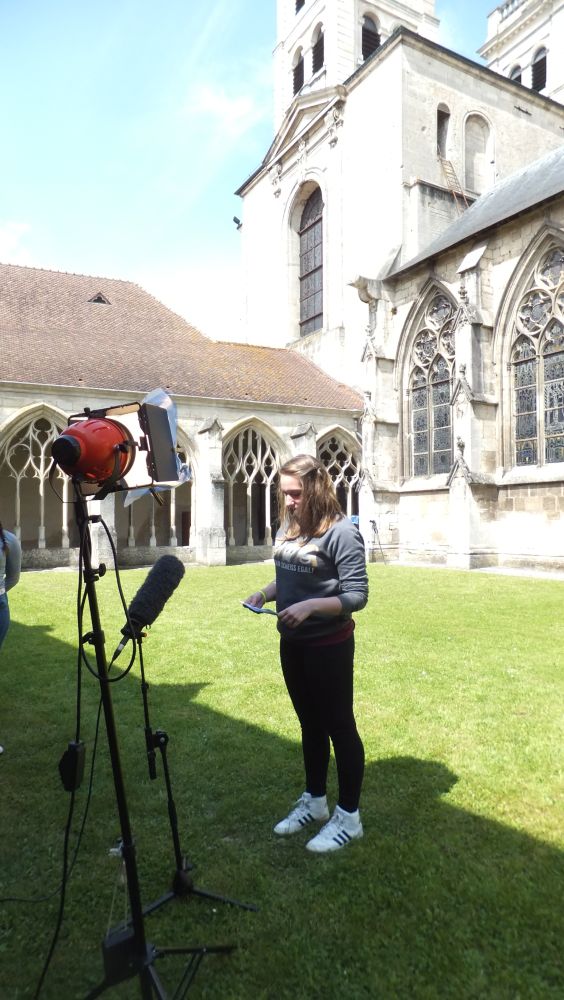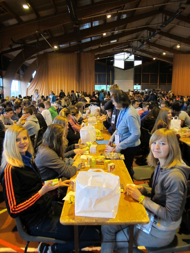 Am Freitagmorgen waren wir erstaunt über unser Frühstück, da es nur aus einem Müsliriegel, einem mit Schokolade gefüllten Milchbrötchen sowie Orangensaft und Schokomilch bestand. Dies sollte auch die anderen Tage so bleiben. Nach dem Frühstück besuchten wir eine wichtige Erinnerungsstätte von Verdun: Le centre mondial de la paix. Dort erhielten wir viele Informationen rund um den 1. Weltkrieg und die Schlacht von Verdun, sangen gemeinsam mit unserer Partnerklasse die Nationalhymnen unserer beiden Länder sowie die Europahymne. Zurück im Zeltlager unternahmen wir weitere Aktivitäten, um unsere Partnerklasse noch besser kennen zu lernen. Dabei wurde nicht nur sprachliches Können, sondern auch ein gutes Gedächtnis abverlangt. Nachdem wir das etwas gewöhnungsbedürftige Mittagessen (bestehend aus einem Sandwich, Kartoffelchips und Wasser) zu uns genommen hatten, fuhren wir zur ersten Generalprobe für die Gedenkzeremonie nach Douaumont. Wir begutachteten die Grab- und Gedenkstätte für die 300 000 gefallenen Soldaten und fuhren dann mit 30 Bussen im Konvoi begleitet von Polizisten wieder zurück in unser Camp. In einer beeindruckenden Freilichtkulisse schauten wir uns am späten Abend die Aufführung „Des flammes à la lumière“ mit anschließendem Feuerwerk, das extra für uns inszeniert wurde, an.