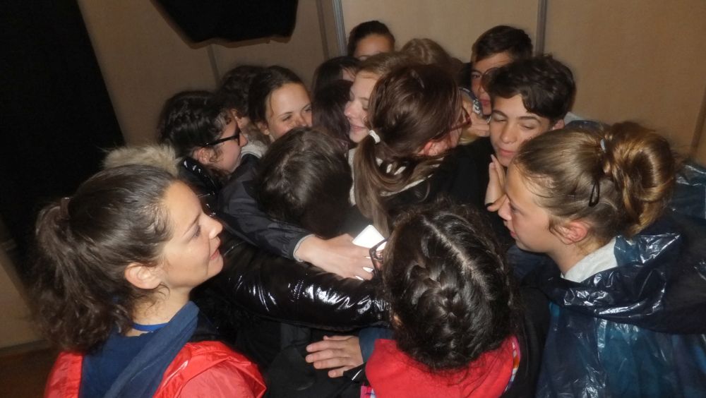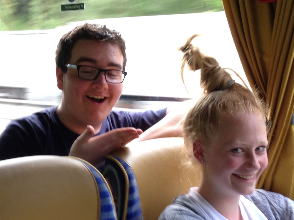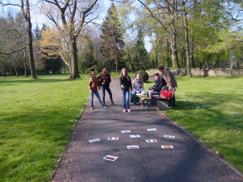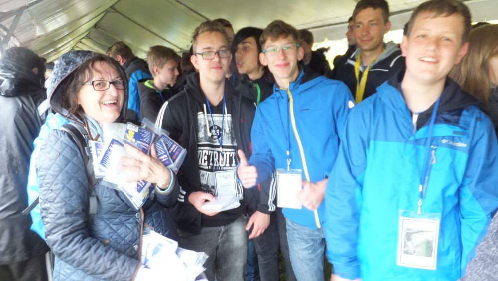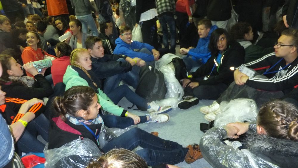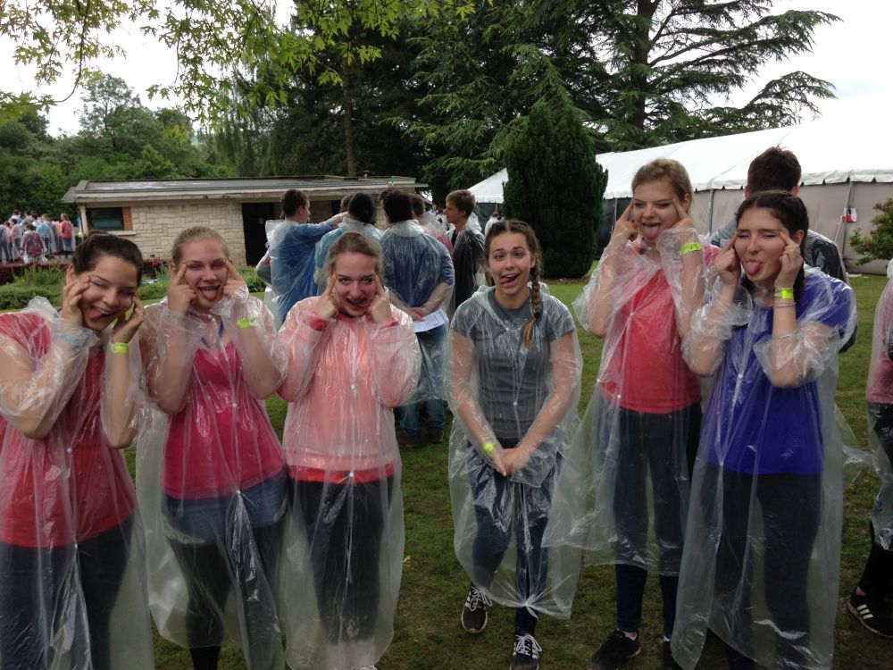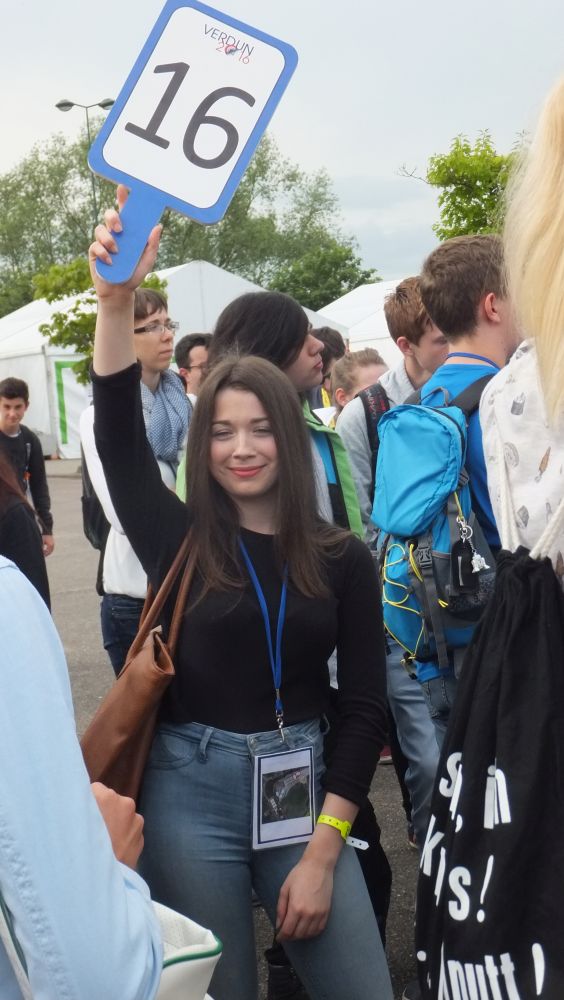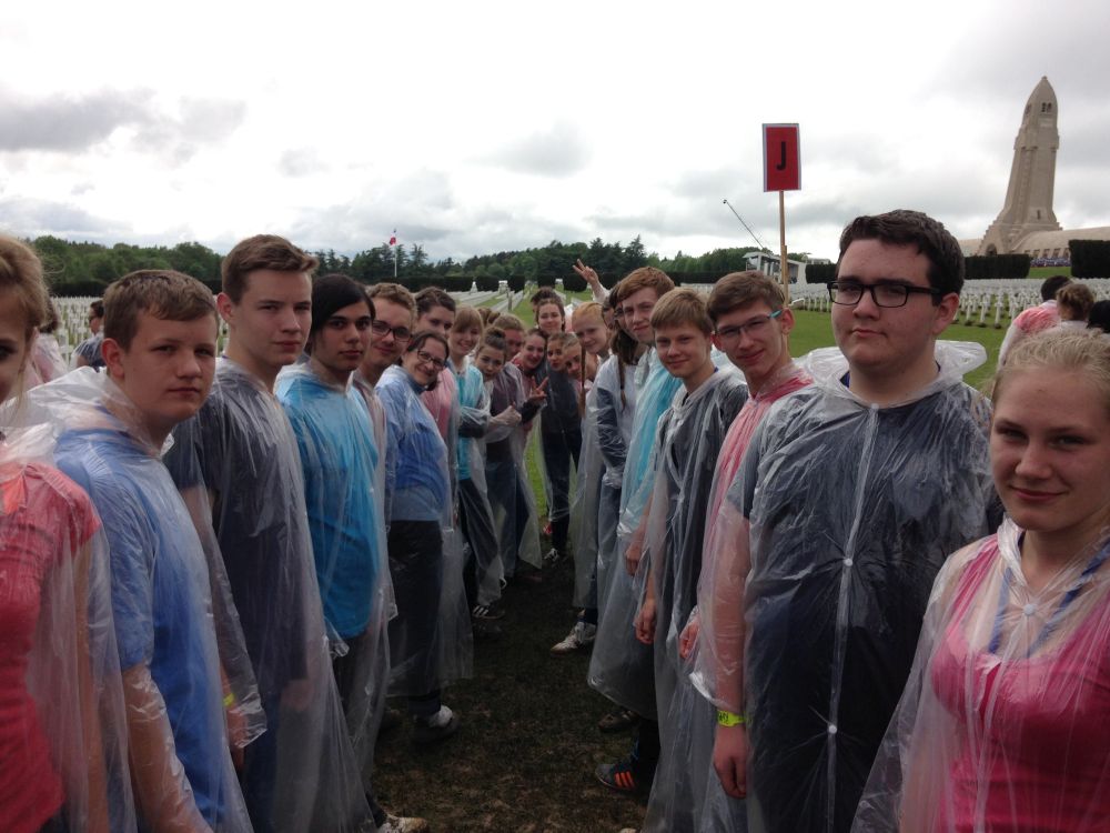 Am Samstagabend wurde noch eine kleine, aber sehr spaßige Disco für uns alle organisiert. Dieser Abend brachte uns mit unserer Partnerklasse noch näher zusammen. Am Abend war die Vorfreude auf den kommenden Tag besonders groß, da wir an einem deutsch-französischen Staatsakt teilhaben sollten. Uns wurde die einmalige Gelegenheit ermöglicht, Angela Merkel und François Hollande zu sehen und ihre Gedenkreden live mitzuerleben. Sonntag fuhren wir bereits 08.30 Uhr von unserem Camp in Richtung Douaumont. Circa 60 Busse fuhren zur Gedenkstätte, wo wir am Nachmittag unsere einstudierte Choreographie bei der Gedenkzeremonie aufführen sollten. Nach einer Generalprobe im Regen verbrachten wir den weiteren Tag mit unserer Partnerklasse, bevor es für unseren großen Auftritt gegen 15.30 Uhr Zeit wurde. Der Regen hörte erst kurz vorher auf. Dann hieß es, Aufstellung nehmen, Choreographie nicht vergessen und auf keinen Fall ohne Poncho im Schlamm ausrutschen – denn im deutschen und französischen Fernsehen gab es eine Liveübertragung. Zum Glück haben wir alle unseren Auftritt gut gemeistert. Da es zum Frühstück und Mittag immer das gleiche Essen gab, bestellten sich viele von uns zurück im Camp am Abend noch eine Pizza – eine Lieferung für 160€. Zum Abschluss evaluierten wir gemeinsam mit unserer Partnerklasse den Aufenthalt in Verdun. Wir schrieben uns gegenseitig Abschiedsbriefe und machten noch tolle Fotos am See. Am letzten Morgen mussten wir endgültig voneinander Abschied nehmen. Es gab viele kräftige Umarmungen von allen. Trotz des schlechten Wetters und der einfachen Unterkunft, bereuen wir es nicht, Teil dieses einmaligen Erlebnisses gewesen zu sein sowie unglaublich nette Menschen, die mit uns durch Höhen und Tiefen gegangen sind, kennen gelernt zu haben.