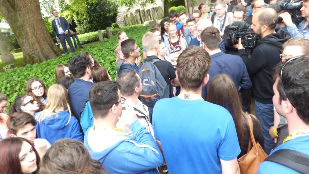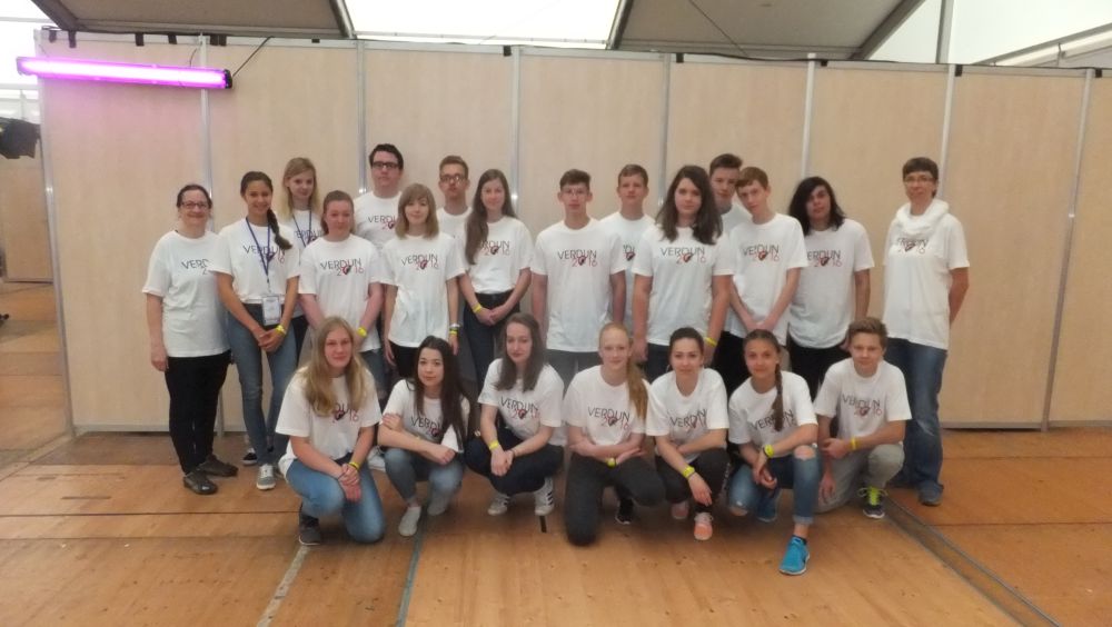 Vom 26. bis 30. Mai 2016 haben 20 Schüler des Französischkurses Klasse 9 an der deutsch-französischen Jugendbegegnung in Verdun teilgenommen. Nachdem wir am Donnerstag nach 10 Stunden Fahrt im Zeltlager in Verdun ankamen, haben wir David Hense, unseren Betreuer des DFJW kennen gelernt. Nach einigen deutsch-französischen Workshops wurden wir von ihm unserer Partnerklasse aus Montpellier vorgestellt. Natürlich mussten auch wir bei einigen Kennenlernspielen aktiv werden. Zum Abschluss des Tages schauten alle 2000 Jugendlichen, die vor Ort waren, gemeinsam den aufschlussreichen Dokumentarfilm Apokalypse Verdun.