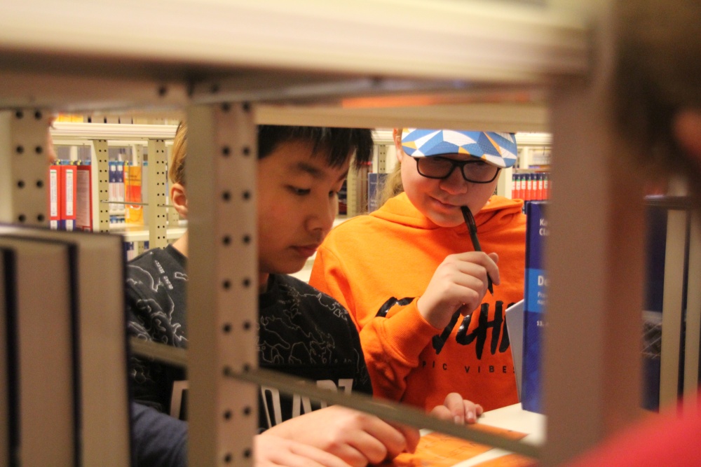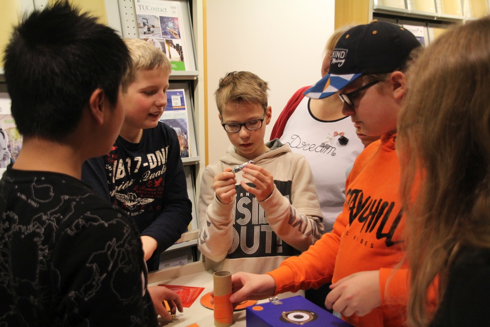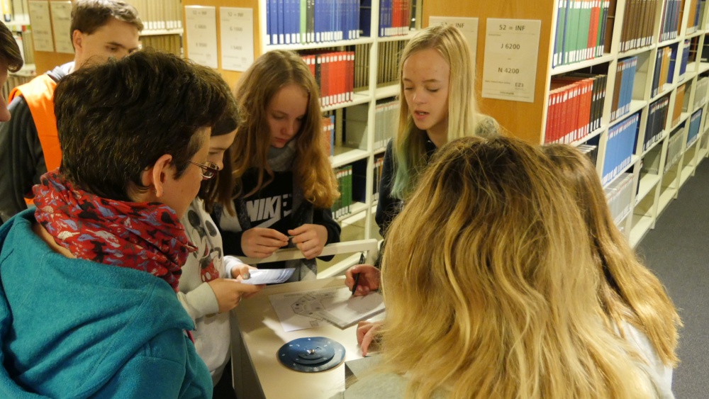 Anschließend konnten wir uns kurz in der Mensa aufwärmen und beim Mittagessen stärken. Da das Wetter immer kühler und feuchter wurde, waren wir sehr froh, dass wir wieder verschiedene Gebäude (wie Reinraum, Maschinen, ...) besichtigen durften. Für die zweite Station suchten wir die Uni-Bibliothek auf, wo wir in drei Gruppen den kniffligen Hinweisen folgten, um das gestohlene Buch für Professor T wiederzufinden. Als Belohnung bekamen wir aus seinem vollen „Schatzbuch“ etwas Süßes.