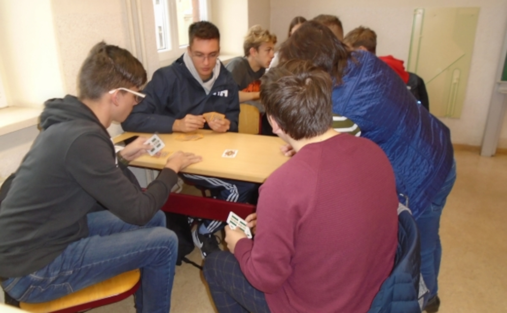 Am Donnerstag besichtigten wir die Innenstadt von Altenburg. Am Skatbrunnen trafen wir uns mit der Stadtführerin Frau Naundorf und tauften dort unser Skatblatt. Sie zeigte uns in einem Rundgang wichtige Sehenswürdigkeiten, erzählte Wissenswertes und lustige Sagen. Wir besuchten den Altenburger Spielkartenladen, aus dem natürlich niemand mit leeren Händen heraus ging. Danach erkundeten wir die Ecken und Winkel des Rathauses. Anschließend stärkten wir uns mit einer Rostbratwurst und verschiedenen Senfen aus dem Altenburger Senfladen. Mit der Besichtigung des Spielkartenmuseums im Schloss beendeten wir unseren Besuch in Altenburg. Unseren letzten Abend verbrachten wir im Z III mit einem Bowlingturnier, gemeinsamen Tänzen und leckerem Abendessen zusammen mit unseren Familien. Unsere Erinnerungen hielten wir in vielen Fotos und Videos fest.