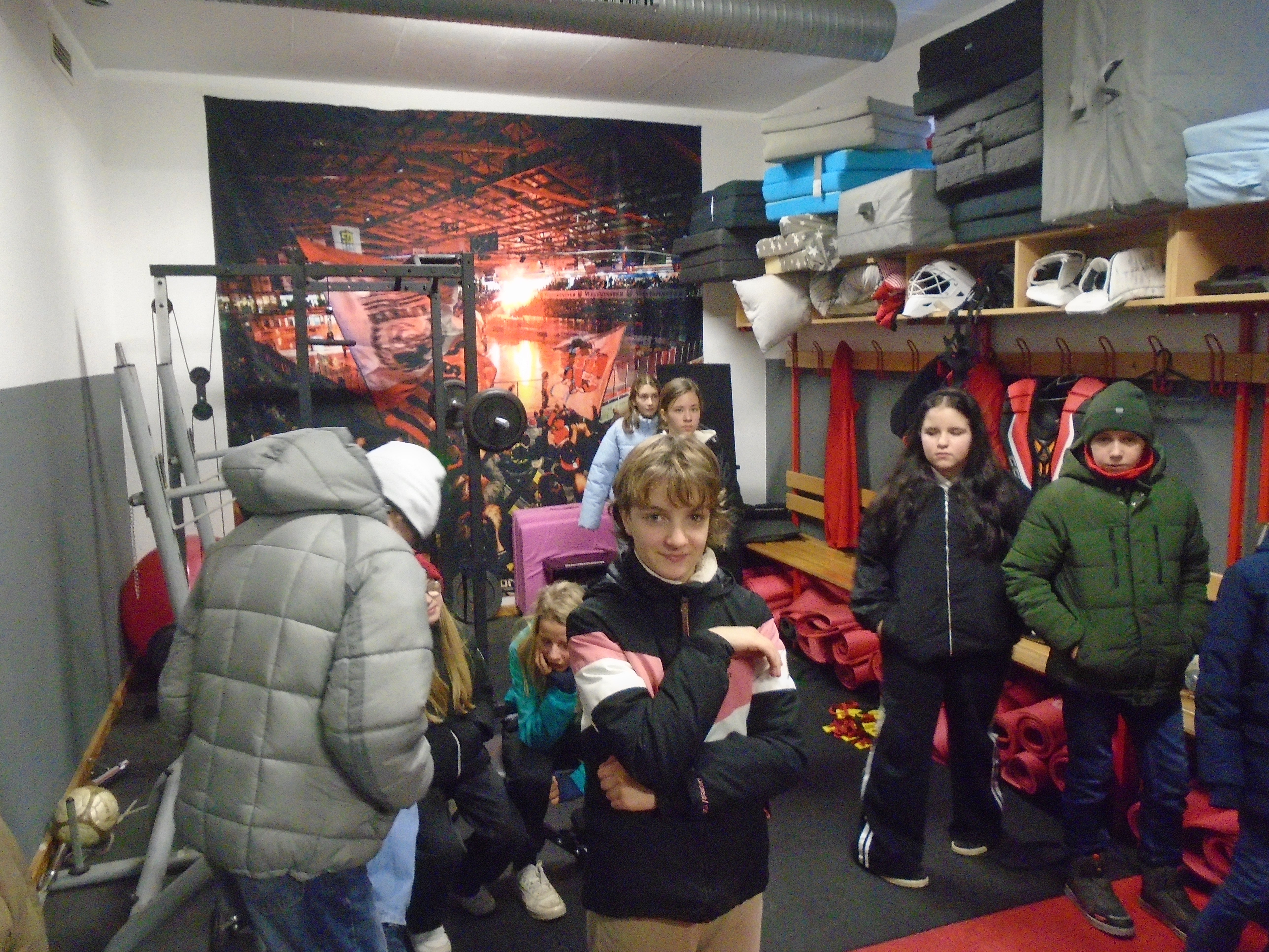 Nach dem Eislaufen wartete die behaglich warme und hübsch dekorierte Sportsbar auf die müden Eisläufer. Zum Aufwärmen gab es heißen Kakao und lauter leckere Plätzchen oder Lebkuchen. Voll motiviert und gestärkt konnte es auch schon weitergehen. Eine Klasse durfte die Stadionführung erleben und die andere blieb in der Stadiongaststätte, um einige Informationen rund um das Vereinsleben und deren Organisation zu bekommen, aber auch um live zu erfahren, welche Ausrüstung ein Eishockeyspieler unter dem Trikot tragen muss, um möglichst „nur“ mit blauen Flecken davonzukommen. Höhepunkt der von Herrn Zipfel angeleiteten Stadionführung war die Besichtigung des Heiligtums der Eispiraten – die Spielerkabine. Mit großen Augen bestaunten die Anwesenden das „Wohnzimmer“ der Eishockeyspieler. Nachdem die eine Klasse von der Stadionführung zurück war, wurde getauscht.