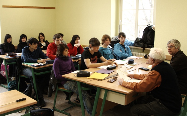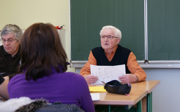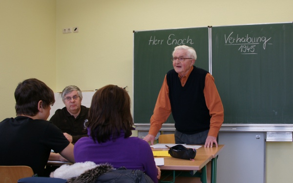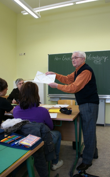 Mit ergreifenden Worten schildert Herr Enoch in einer 11. Klasse unseres Gymnasiums seine Erlebnisse aus der Zeit von 1945/46, bis er über die Stationen Brandenburg und Sachsen im thüringischen Meuselwitz eine neue Heimat finden konnte.