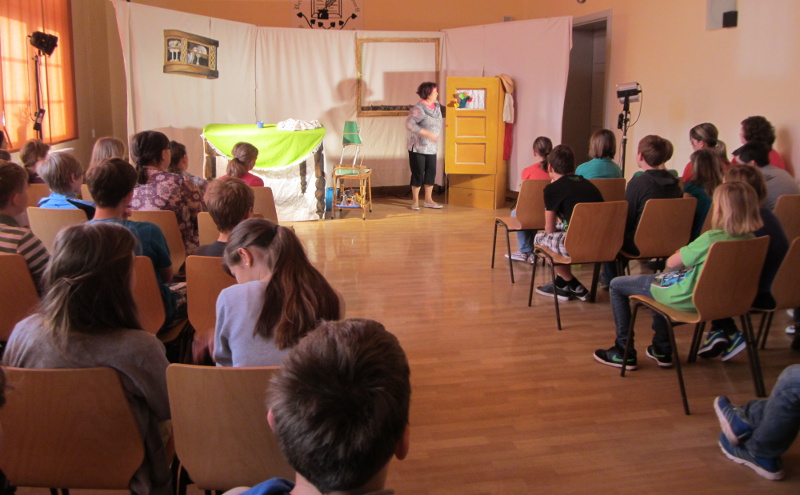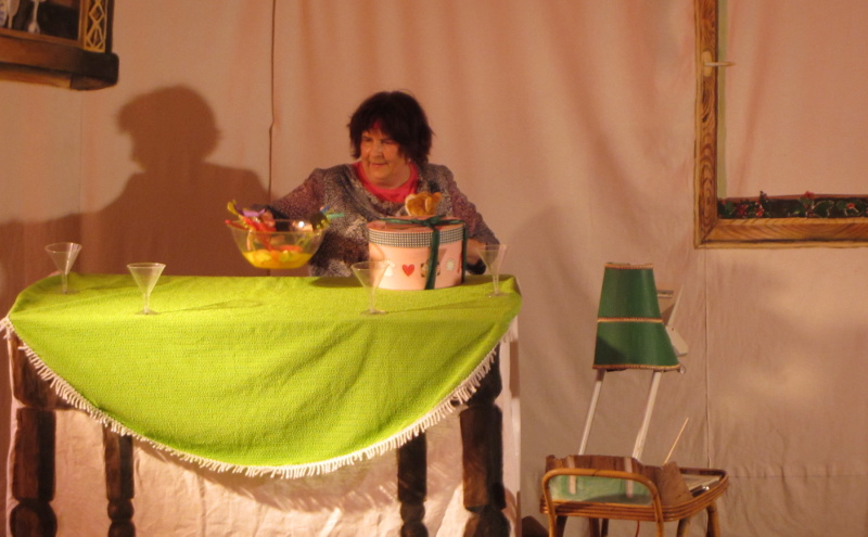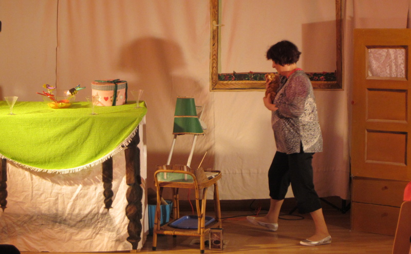 Madame Rose erzählte und spielte ihren ganzen Geburtstag nach: von der Planung, über den angegessenen Kuchen, bis zum etwas komischen Punsch - aber die Hauptsache war ihre Katze, die den Kuchen anfraß oder sich im Schrank versteckte. Da greift man auch schon mal zu anderen Mitteln, um sie da wieder herauszulocken. So verkleidete sich Madame Rose schnell mal als Sensenmann, um ihre Katze aus dem Schrank „rauszuekeln“. Es folgte auch schnell das nächste Problem: „Kein Bild an der Wand“ - da malt man eben selber eins. Doch der Inhalt hat sich regelrecht „verflüchtigt“: so ist in ihrem „Kunstwerk“ der Vogel ausgeflogen. „Nein, auch das noch, jetzt klingelt es noch an der Tür, wer mag das wohl sein ?“ Und wer war´s ? … der Postbote mit einem Geschenk von Madame Rose, ihrer Tochter … und was wurde geschickt: eine Puppe, die richtig gut tanzen kann. Da vergisst man gleich die ganze Hektik und legt mit der Hand an der Figur einen richtig