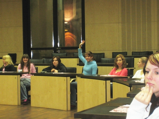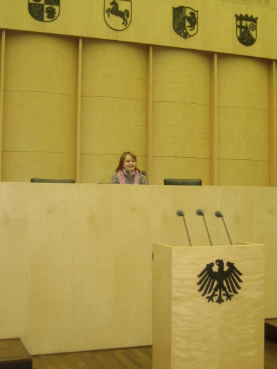 Nachdem die anfänglichen Kommunikationsprobleme überwunden waren, wurde die zweistündige Zugfahrt zur internationalen „Erzählrunde“ eröffnet. Viel Zeit zum Umschauen auf dem Berliner Hauptbahnhof blieb erst mal nicht. Nach einem ca. zehnminütigen Weg kamen wir am Reichstag an. Ein überwältigendes Gebäude! Noch überwältigender schien es, als ungefähr 200 wartende Besucher unter der Überdachung vor dem starken Regen Unterschlupf suchten. Eine Stunde später war unsere 32-Mann Gruppe dran. Nach strengsten Sicherheitskontrollen durften wir schließlich die Eingangsschleuse passieren. Mit dem Fahrstuhl ging es hinauf bis zur Kuppel, von welcher man einen wunderschönen Ausblick über Berlin genießen konnte. Wieder unten angekommen ergab sich die Möglichkeit unserer Bundeskanzlerin, Frau Angela Merkel, aus ca. 30 Metern noch einmal zuzuwinken. Dann ging es im Eiltempo zum Bundesrat, da wir schon ein wenig im Verzug waren. Dort angekommen erhielten wir eine Führung durch das Gebäude des ehemaligen Preußischen Herrenhauses. Das Aufregendste hierbei war das Rollenspiel im Plenarsaal, bei dem jeweils 2 Schüler die Vertretung eines Bundeslandes übernahmen und ihre eigene Meinung am Rednerpult mit überzeugenden Argumenten darlegten. Auf der zu diskutierenden Tagesordnung stand die Frage, ob für Fahranfänger eine 0,3 Promille-Grenze gelten sollte. Natürlich nahmen wir den Vorschlag an. Ohne Verschnaufpause ging es im Laufschritt weiter zur Thüringer Landesvertretung. Auf dem Weg ins Trockene durchquerten wir das Brandenburger Tor. Endlich angekommen! Zu unserer großen Überraschung und Freude standen dort schon ungefähr 30 Flaschen Saft und Wasser für uns bereit. Durch den riesigen Informationsfluss, der auf uns in den letzten vier Stunden eingewirkt hatte, mussten wir unser Gehirn mit etwas weniger Anstrengendem entlasten.
