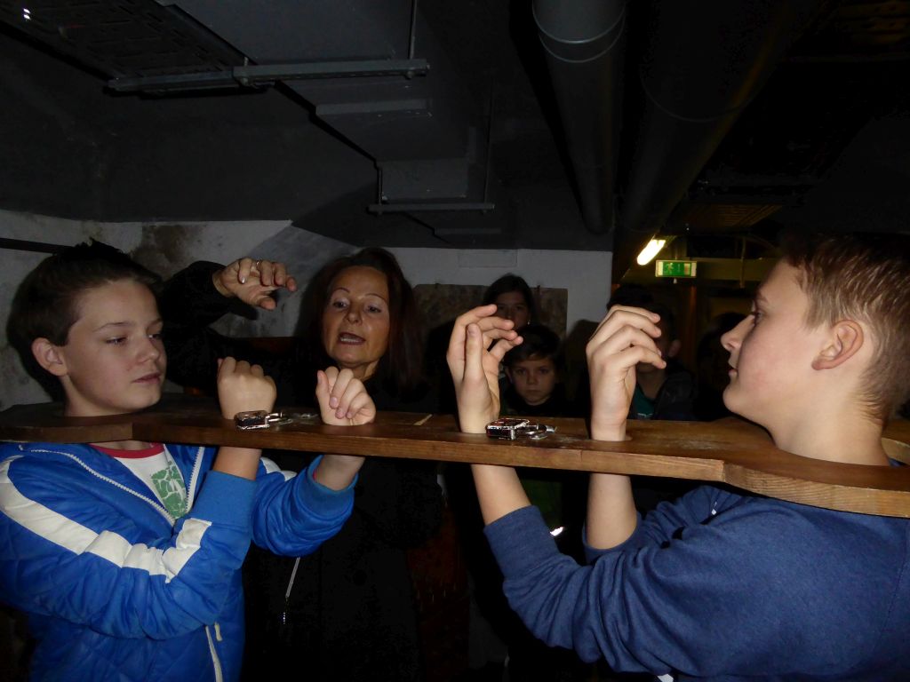 Zuerst hatte uns die Museumspädagogin an einem Modell die wichtigsten und berühmtesten Gebäude von Leipzig vor 850 Jahren erklärt. Anschließend haben wir auch das unterirdische Verlies besichtigt. Dort war es eng und dunkel. Die Museumspädagogin hat über Strafen und Foltermethoden berichtet und wir wurden über die Rechte im Mittelalter aufgeklärt. Wir merkten schnell, dass man damals sehr streng war und bei Kleinigkeiten bereits vor Gericht kam. Wir durften auch einige Geräte von damals anschauen und ausprobieren. Es war für uns zunächst lustig und dann stellten wir fest, dass die Methoden, mit denen die Menschen schon bei geringen Vergehen gequält und bestraft wurden, sehr schmerzhaft und grausam gewesen sein mussten. Alle waren froh in unserer heutigen Zeit zu leben.