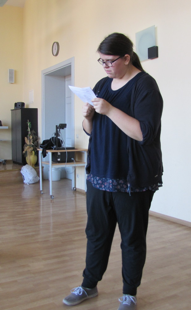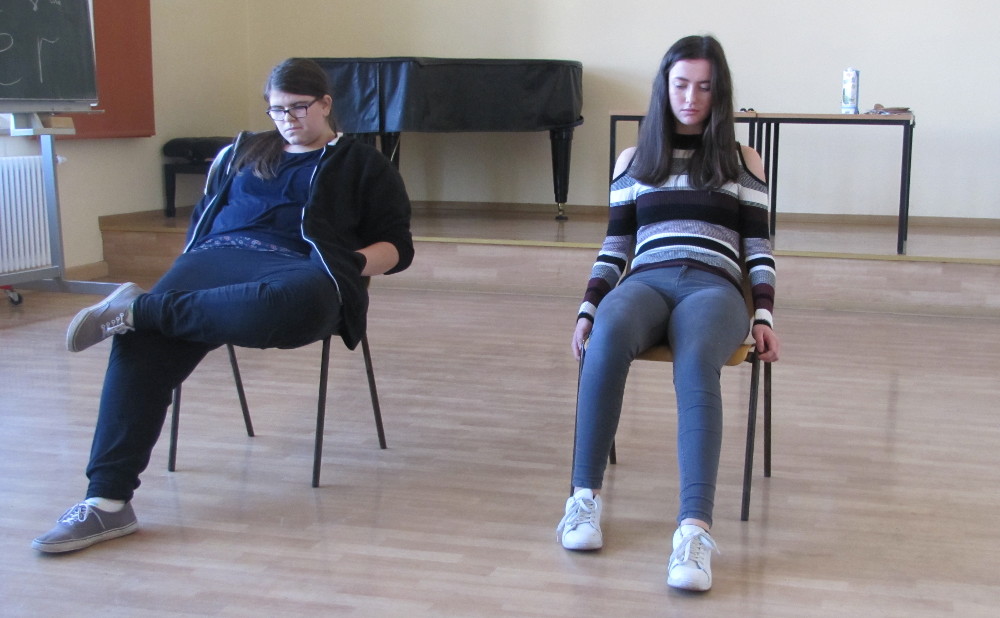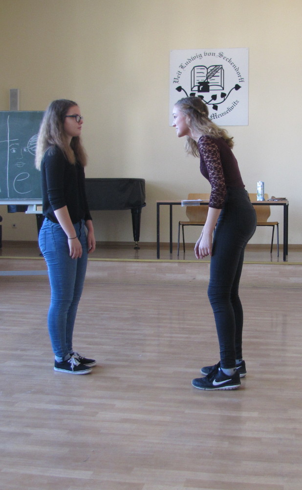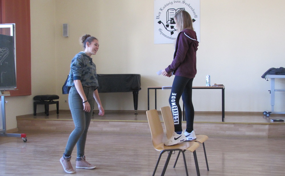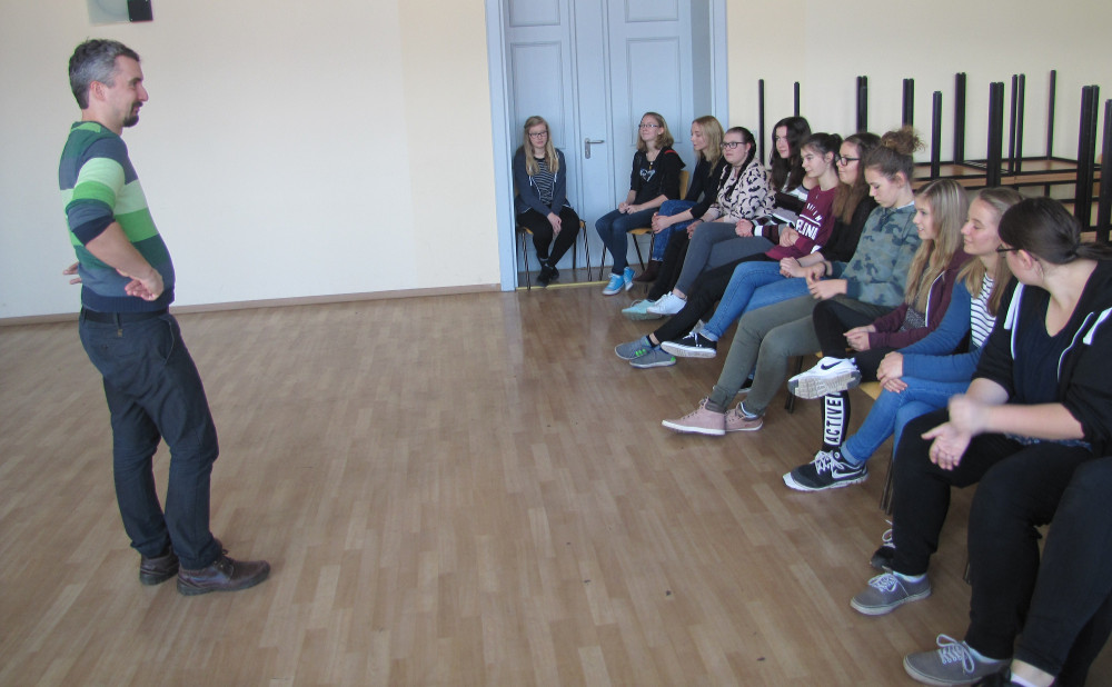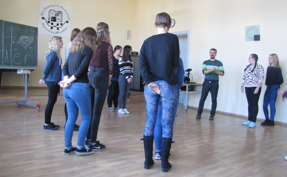 Der Workshop sollte uns helfen, unsere Bühnenpräsenz zu verbessern. Dabei holten wir uns Hilfe vom Theaterpädagogen Herrn Schönherr, der uns die Schauspielerei auf sehr anschauliche Art und Weise näher brachte und zeigte, dass es mehr bedarf, als nur einen Text auswendig zu lernen.